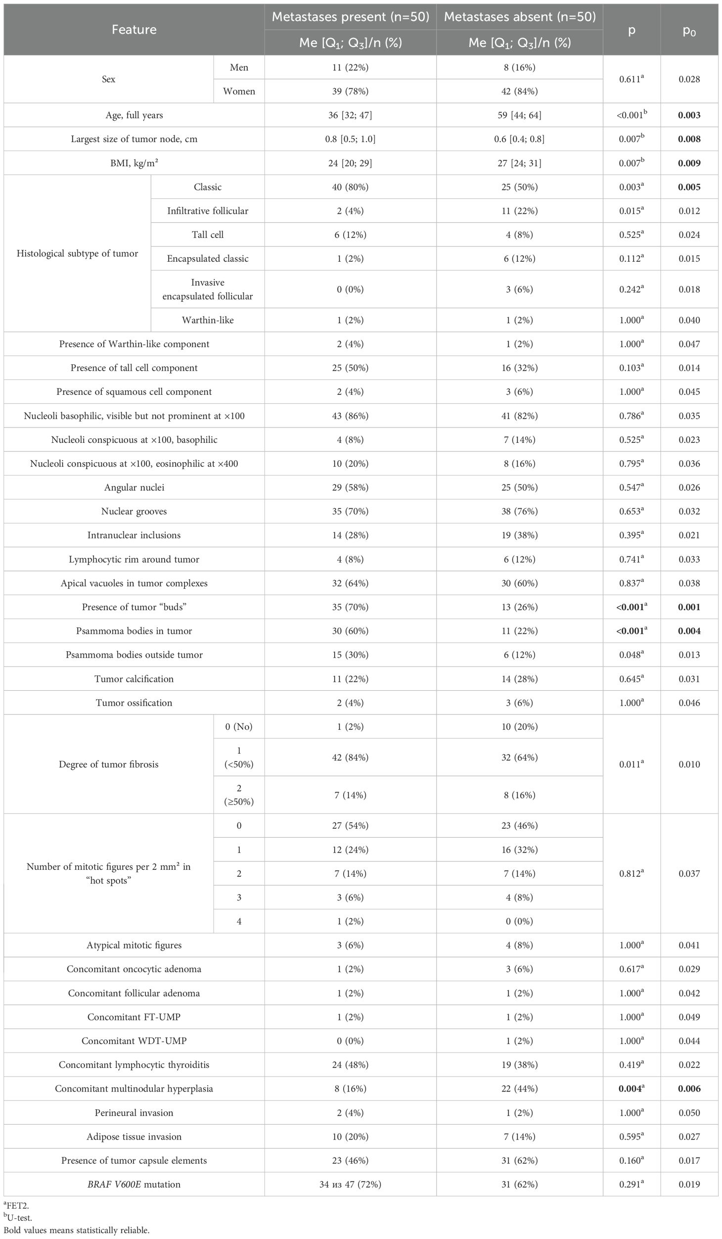 The comparative analysis revealed that patients with metastases were younger (p<0.001; p0 = 0.003), had a lower BMI (p=0.007; p0 = 0.009), and a larger tumor node size (p=0.007; p0 = 0.008). The classic subtype of carcinoma (p=0.003; p0 = 0.005), psammoma bodies in tumor tissue (p<0.001; p0 = 0.004), and tumor “buds” (p<0.001; p0 = 0.001) were more frequently identified in these patients. No metastases were found in patients with tumor node sizes <0.3 cm. Concomitant multinodular hyperplasia was less common in patients with metastases compared to those without (p=0.004; p0 = 0.006). Patients with metastases also showed a statistical trend toward more pronounced tumor fibrosis (p=0.011; p0 = 0.010) and more frequent detection of psammoma bodies in thyroid tissue outside the tumor (p=0.048; p0 = 0.013). In patients without metastases, a statistical trend toward more frequent detection of the infiltrative follicular tumor subtype was observed (p=0.015; p0 = 0.012).