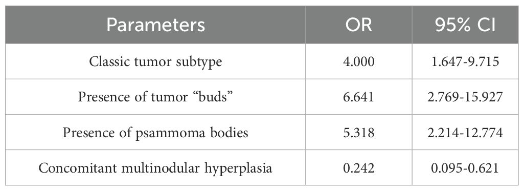 Discussion: The combination of these features may enhance risk stratification and guide the clinical management of PTMC patients, including decisions on surgical extent and follow-up strategies. Our findings support the relevance of comprehensive histological and clinical evaluation in predicting the metastatic potential of PTMCs.