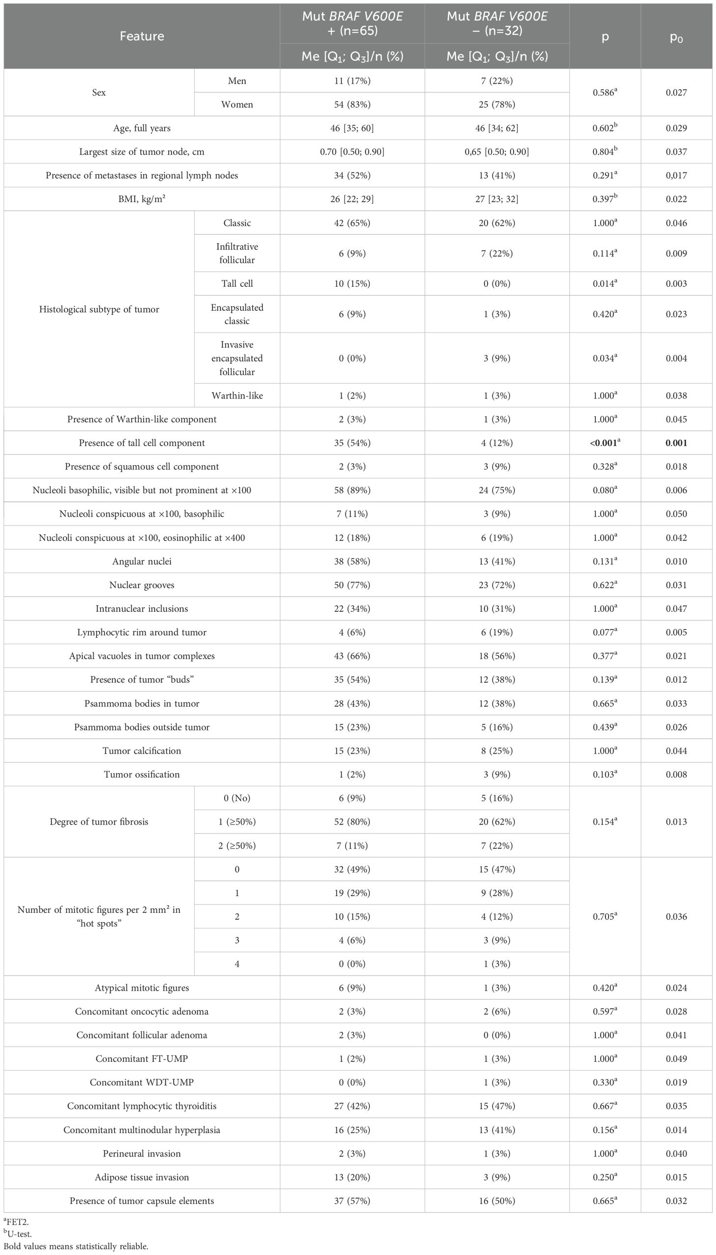 Analysis of the BRAF V600E mutation revealed its presence in 65 out of 97 patients in the overall group (11 men, 54 women). Patients with the BRAF V600E mutation had a significantly higher frequency of tall cell tumor components (p<0.001; p0 = 0.001). There was also a statistical trend toward a higher frequency of the tall cell tumor subtype (p=0.014; p0 = 0.003) and a lower frequency of the invasive encapsulated follicular subtype (p=0.034; p0 = 0.004) compared to patients without the mutation.