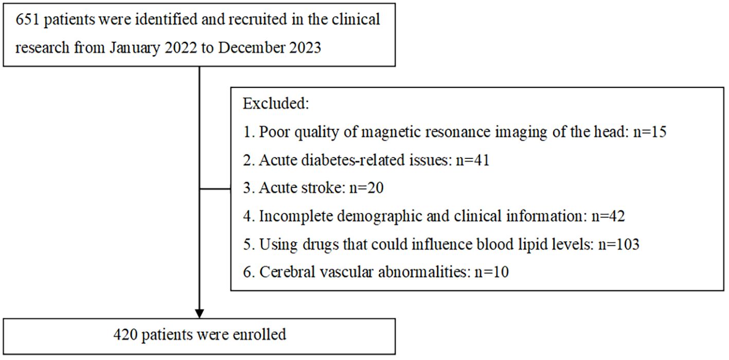 The sample size was determined assuming an expected exposure rate of 50% in the control group and an odds ratio of 2.0, with α = 0.05, power = 0.8, one controls per case, the sample should consist of 137 cases and 137 controls. Sample size estimation was conducted using R website for epi package (https://zstats.medsta.cn/samplesize/). In total, this study involved 420 T2DM patients confirmed (Figure 1), including 263 positive patients and negative 157 patients, which exceeded 137 per group. All patients were performed by Brain MRI scans on a 1.5T MR scanner (GE Signa VH/I, USA). Data that was missing, amounting to less than 10%, has been deleted outright. The imaging sequences included axial T1-weighted, T2-weighted, Fluid-Attenuated Inversion Recovery, and diffusion-weighted imaging.