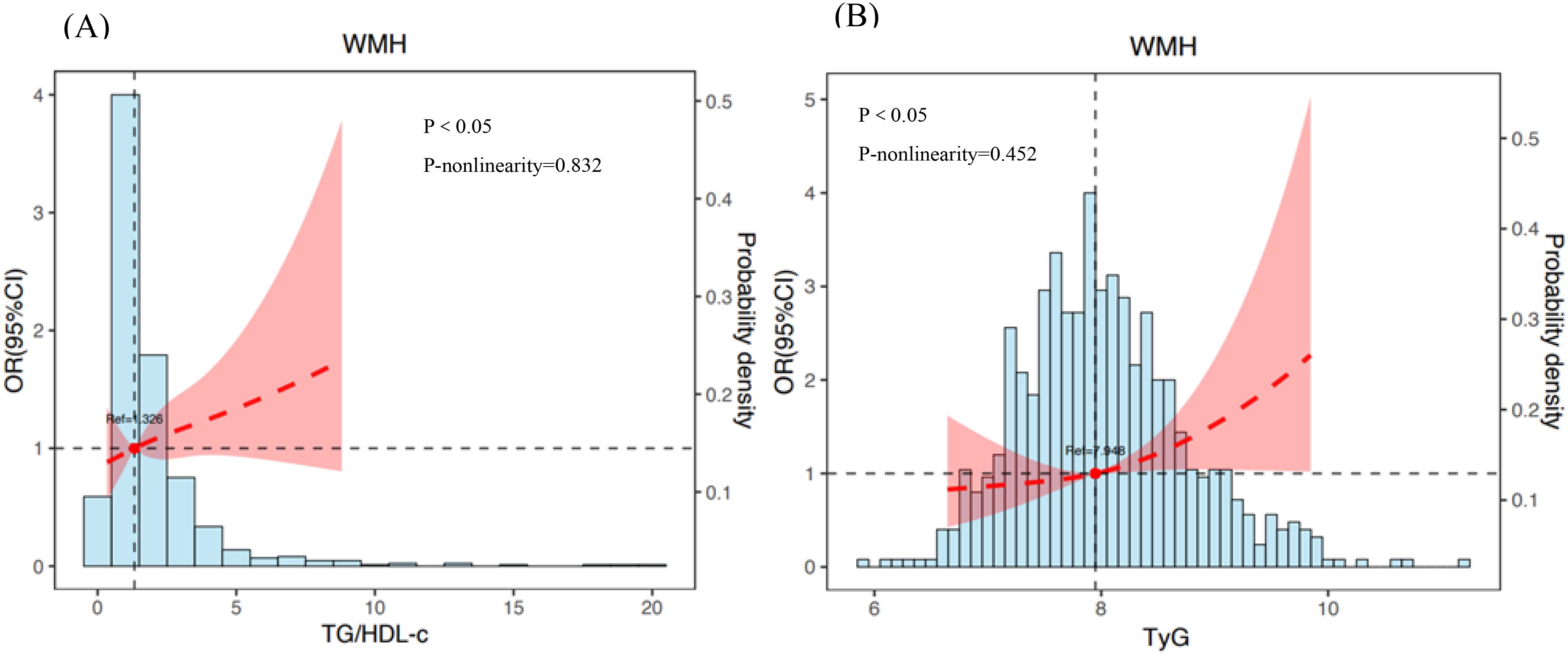 Figure 2. The association between TG/HDL-c (A) or TyG (B) and risk of WMH. Adjusted for variables such as age, sex, diabetes duration, hypertension, duration of diabetes duration, FBG, glycated hemoglobin, SBP and DBP. The dotted line indicates odds ratio, while the shadow indicates 95% CI.