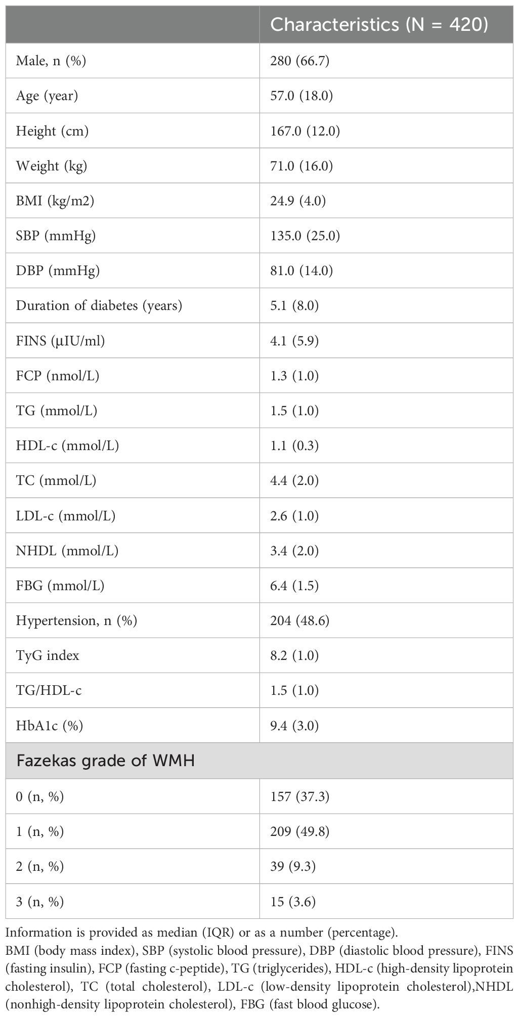 Between January 2022 and December 2023, 651 participants were screened. Participants with poor-quality of magnetic resonance imaging of the head (n = 15), acute diabetes-related issues (n = 41) or acute stroke (n = 20), incomplete demographic and clinical information (n=42), using drugs that could influence blood lipid levels (n=103) and cerebral vascular abnormalities (n=10) were excluded. The study included 420 individuals. The median age for the population was 57.0(18.0) years, and 280 (66.7%) of the individuals were male. There were 157 patients with no WMH (Fazekas score = 0), 263 patients with positive WMH (Fazekas score≥1) among whom 209 (49.8%) participants were Fazekas grade = 1, 39 (9.3%) participants were Fazekas grade = 2, 15 (3.6%) participants were Fazekas grade = 3. (Table 1).