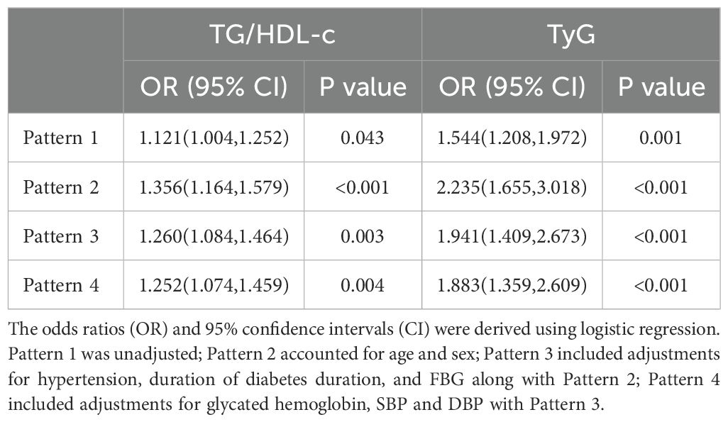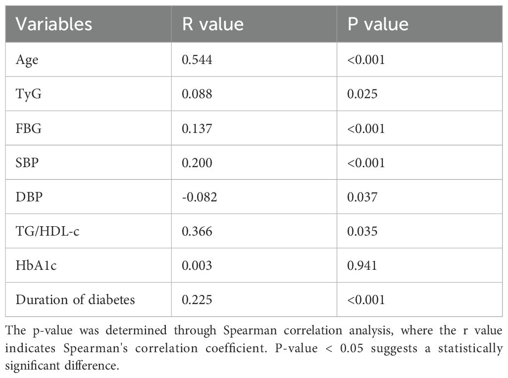 Participants’ demographic characteristics and medical histories were reviewed, focusing on hypertension, age, gender, and the duration of their diabetes. Blood glucose, blood pressure, and serum lipid levels were evaluated on the second day of admission from venous blood samples collected after fasting overnight. HbA1c was assessed by employing high-performance liquid chromatography with the hemoglobin testing system from Bio-Rad Laboratories, based in Hercules, CA, USA. Plasma glucose was measured using glucose oxidase, while total cholesterol (TC), high-density lipoprotein cholesterol (HDL-c), triglyceride (TG), and low-density lipoprotein cholesterol (LDL-c) were assessed with the autoanalyzer (AU5800; Beckman coulter, CA, USA). All assessments were performed in the same laboratory, and the TG/HDL-c was calculated as TG (mmol/L) divided by HDL-c (mmol/L) (21). The TyG = ln[1/2*TG(mg/dl) × fasting blood glucose (mg/dl)] (22). TG:1 mmol/L(88.5 mg/dL), fasting blood glucose:1 mmol/L(18.0 mg/dL).