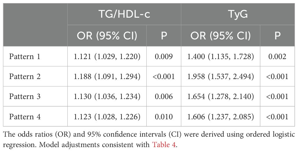 Table 3 presents the connection between the TG/HDL-c or TyG index and the severity of WMH using ordered regression models. Following additional adjustments for confounders, TG/HDL-c was still significantly associated with WMH (OR 1.123, 95% CI 1.028-1.226, P = 0.010). The TyG was significantly and positively related with WMH in a fully adjusted model (OR 1.606, 95% CI 1.237-2.085, P < 0.001). Stronger connections were found between the TyG and WMH compared to the TG/HDL-c. The VIFs indicating no strong multicollinearity among the variables. The test of parallel lines indicated that the proportional odds assumption was met (χ² = 24.109, df = 18, P = 0.151). Residual analysis indicates that the fundamental assumptions of the model are satisfied.