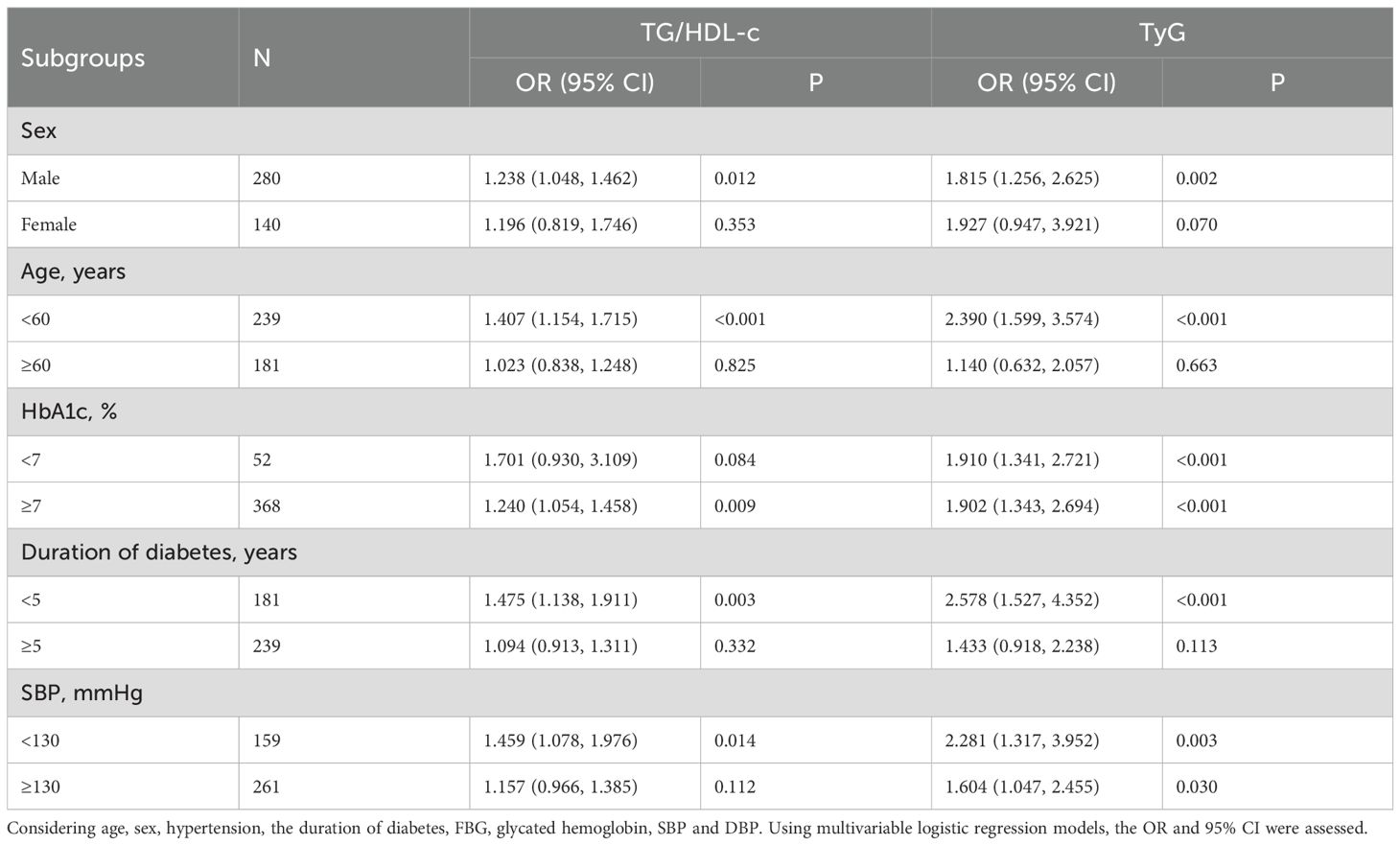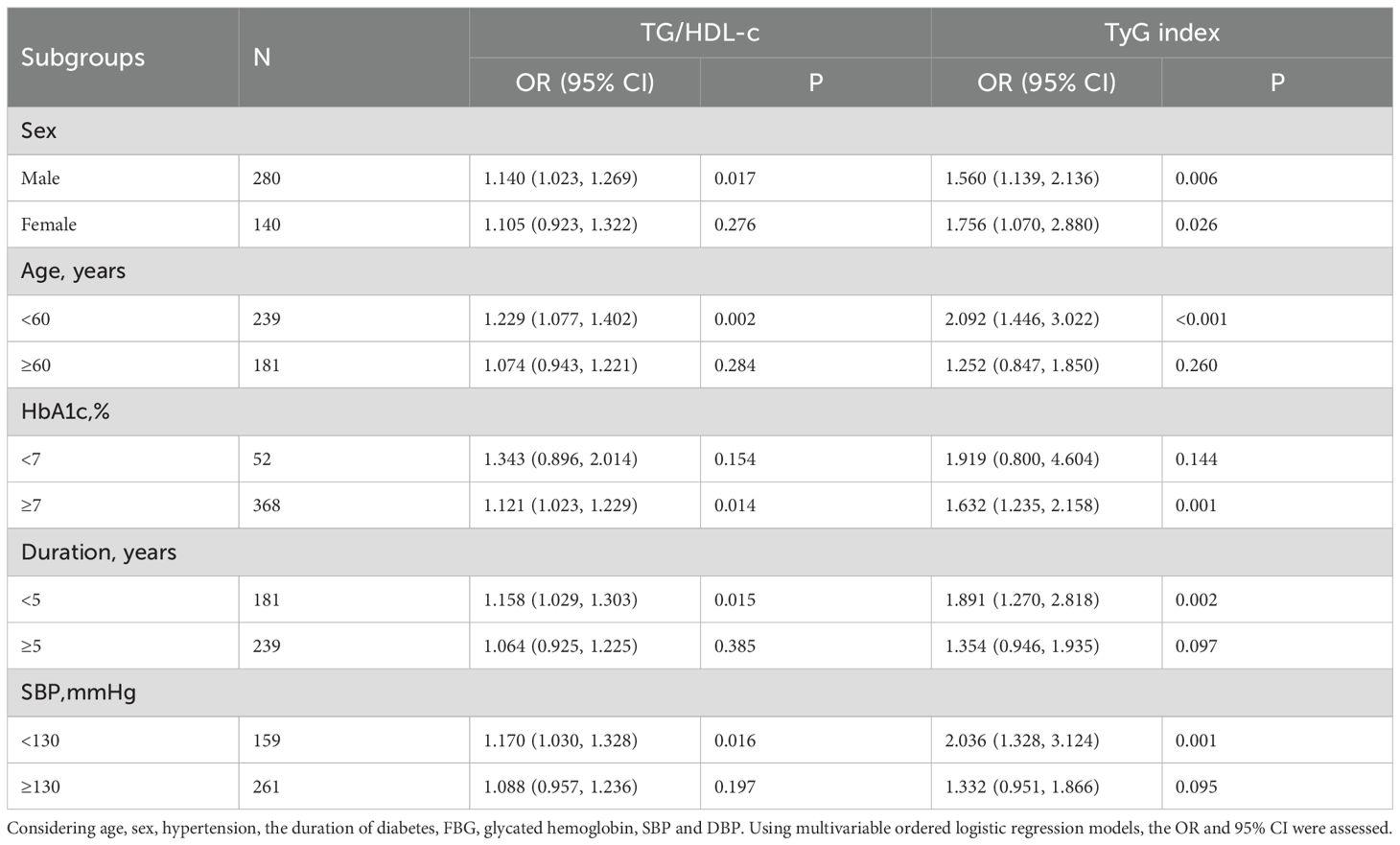 Results: The median age of the study participants was 57.0 (18.0) years, 280 (66.7%) were men, and 263 (62.7%) were WMH-positive. The Fazekas score was correlated with the TG/HDL-c (r=0.366, P = 0.035) and TyG(r = 0.088, P = 0.025). Binary logistic regression analysis showed that TG/HDL-c (OR = 1.252, 95% CI 1.074-1.459) and TyG (OR = 1.883, 95% CI 1.359-2.609) were associated with the WMH. Multivariate adjusted restricted cubic spline plots showed a linear relationship between TG/HDL-c or TyG (P < 0.05, P-nonlinear > 0.05) and WMH. Multiple ordered logistic regression analyses showed that TG/HDL-c(OR = 1.123, 95% CI 1.028-1.226) and TyG (OR = 1.606, 95% CI 1.237-2.085) were independently associated with the burden of WMH. Subgroup analysis showed that TG/HDL-c were more substantially correlated with the WMH in male T2DM patients with a shorter duration of diabetes, younger age, lower blood pressure levels, and poor glycemic control (p<0.05). A comparable association of the TyG with WMH was also observed in these subgroups.