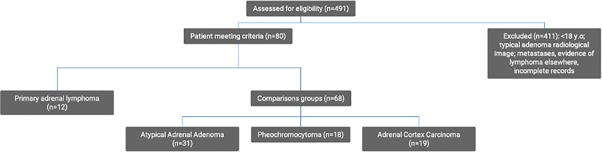 Flowchart showing participant selection for a study. Initially, 491 patients were assessed for eligibility. From these, 411 were excluded due to criteria like age under eighteen, typical adenoma radiological image, metastases, evidence of lymphoma elsewhere, or incomplete records. Eighty patients met the criteria. These were divided into groups: 12 with primary adrenal lymphoma, and 68 in comparison groups. The comparison groups further include 31 with atypical adrenal adenoma, 18 with pheochromocytoma, and 19 with adrenal cortex carcinoma.
