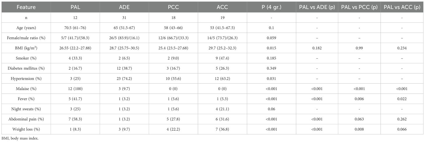 Table 1. Demographic and clinical characteristics of patients with PAL, ADE, PCC and ACC.