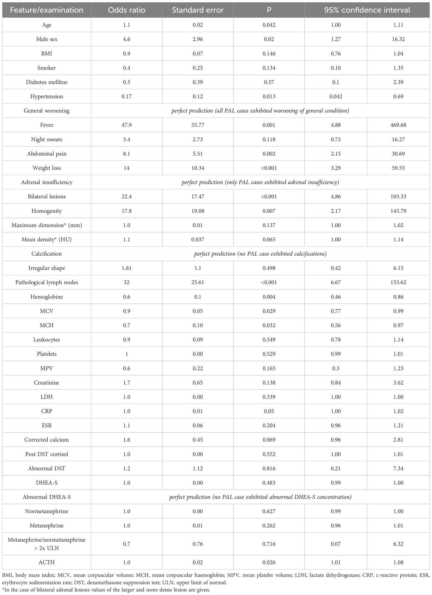 Associations between the presence of PAL and other variables were tested by simple logistic regression. Odds ratios (ORs) for the investigated outcome were significantly higher for age, male sex, several clinical symptoms (fever, abdominal pain, weight loss, AI, and general worsening), homogeneity of an adrenal mass, bilateral adrenal involvement, presence of abdominal lymphadenopathy, ACTH, and anemia (Table 5). OR was lower in the case of hypertension and elevated DHEA-S. MCV and MCH were two continuous variables associated negatively with the presence of PAL.