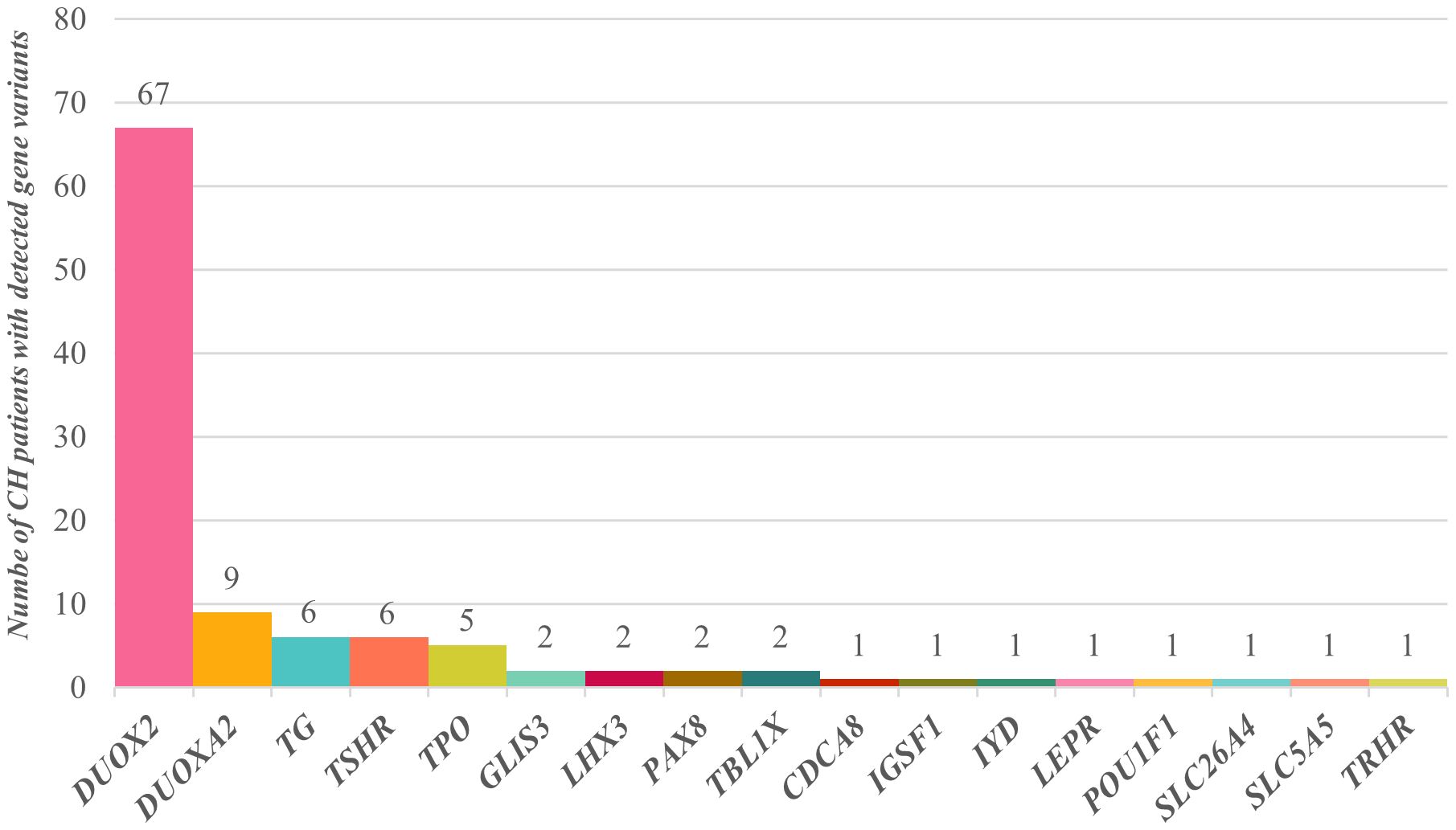 Figure 1. Distribution of CH-related gene variants in 91 children. Sixty-seven children had DUOX2 gene variants, 9 had DUOXA2 gene variants, 6 had TG gene variants, 6 had TSHR gene variants, and 5 had TPO gene variants. Variants in the GLIS3, LHX3, PAX8, and TBL1X genes were each detected in 2 children, and CDCA8, IGSF1, IYD, LEPR, POU1F1, SLC26A4, SLC5A5, and TRHR gene variants were each detected in a single child.