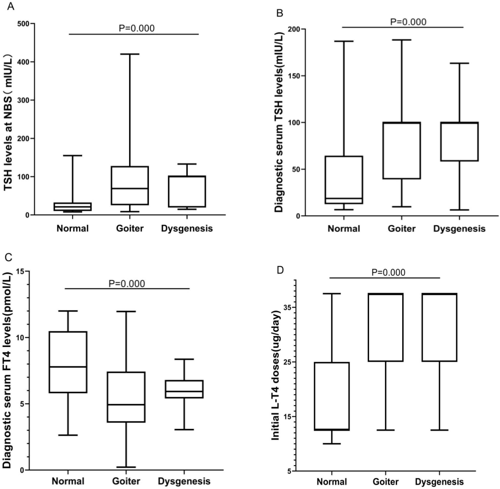 Figure 2. Differences in biochemical results and initial L-T4 doses among “normal”, “goiter”, and “dysgenesis” thyroid morphology groups. (A) The BOX plot chart shows the differences among the three groups regarding TSH levels at NBS. (B) The BOX plot chart shows the differences among the three groups regarding diagnostic serum TSH levels. (C) The BOX plot chart shows the differences among the three groups regarding diagnostic serum FT4 levels. (D) The BOX plot chart shows the differences among the three groups regarding the initial L-T4 doses. A P value <0.001 was considered to indicate an extremely significant difference.