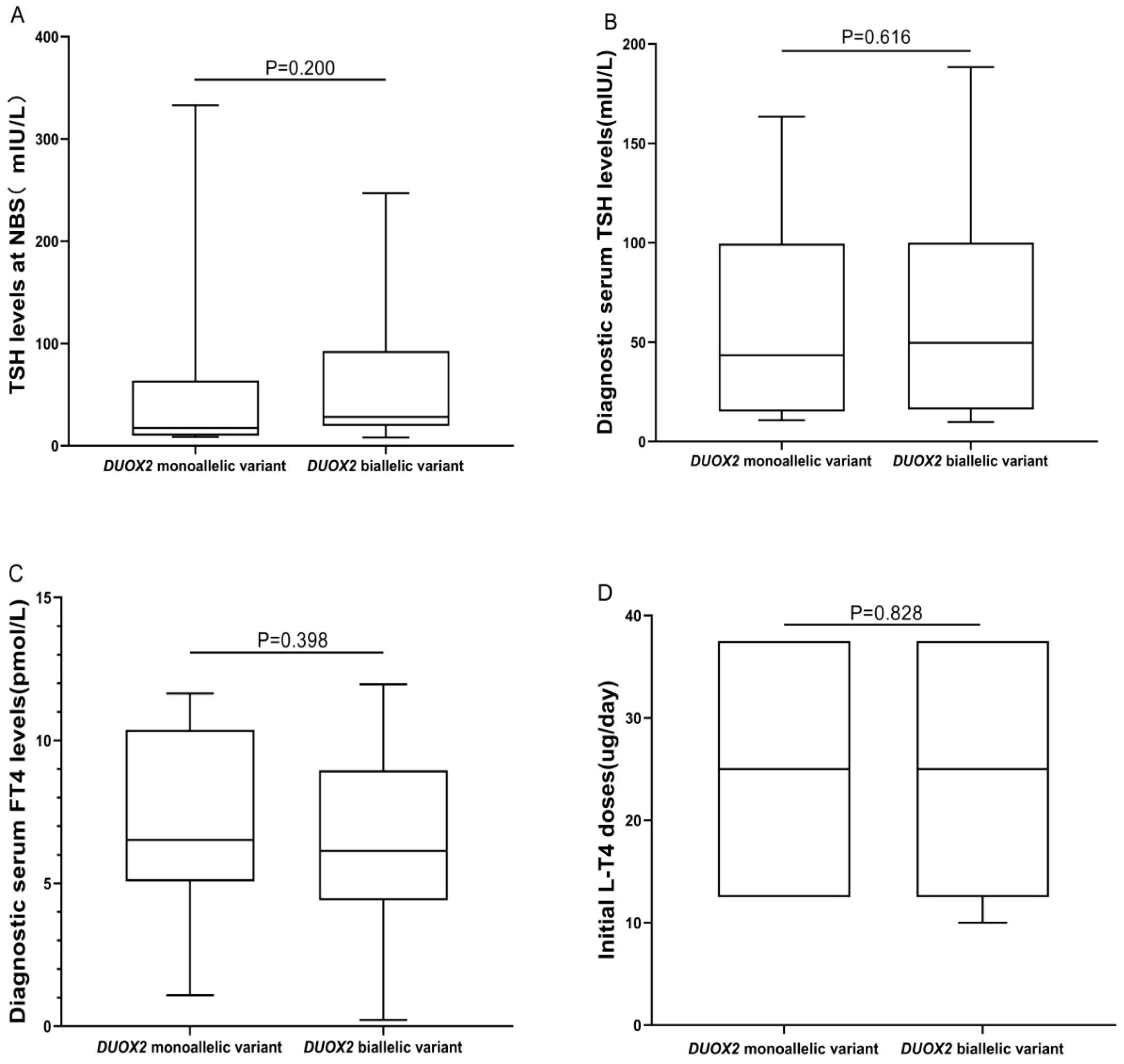 Figure 3. Differences in biochemical results and initial L-T4 doses between “DUOX2 monoallelic variant” and “DUOX2 biallelic variant” groups. (A) The BOX plot chart shows the differences between the DUOX2 monoallelic and biallelic variant groups regarding TSH levels at NBS. (B) The BOX plot chart shows the differences between the DUOX2 monoallelic and biallelic variant groups regarding diagnostic serum TSH levels. (C) The BOX plot chart shows the differences between the DUOX2 monoallelic and biallelic variant groups regarding diagnostic serum FT4 levels. (D) The BOX plot chart shows the differences between the DUOX2 monoallelic and biallelic variant groups regarding the initial L-T4 doses. P>0.05 was considered to indicate no statistical significance.