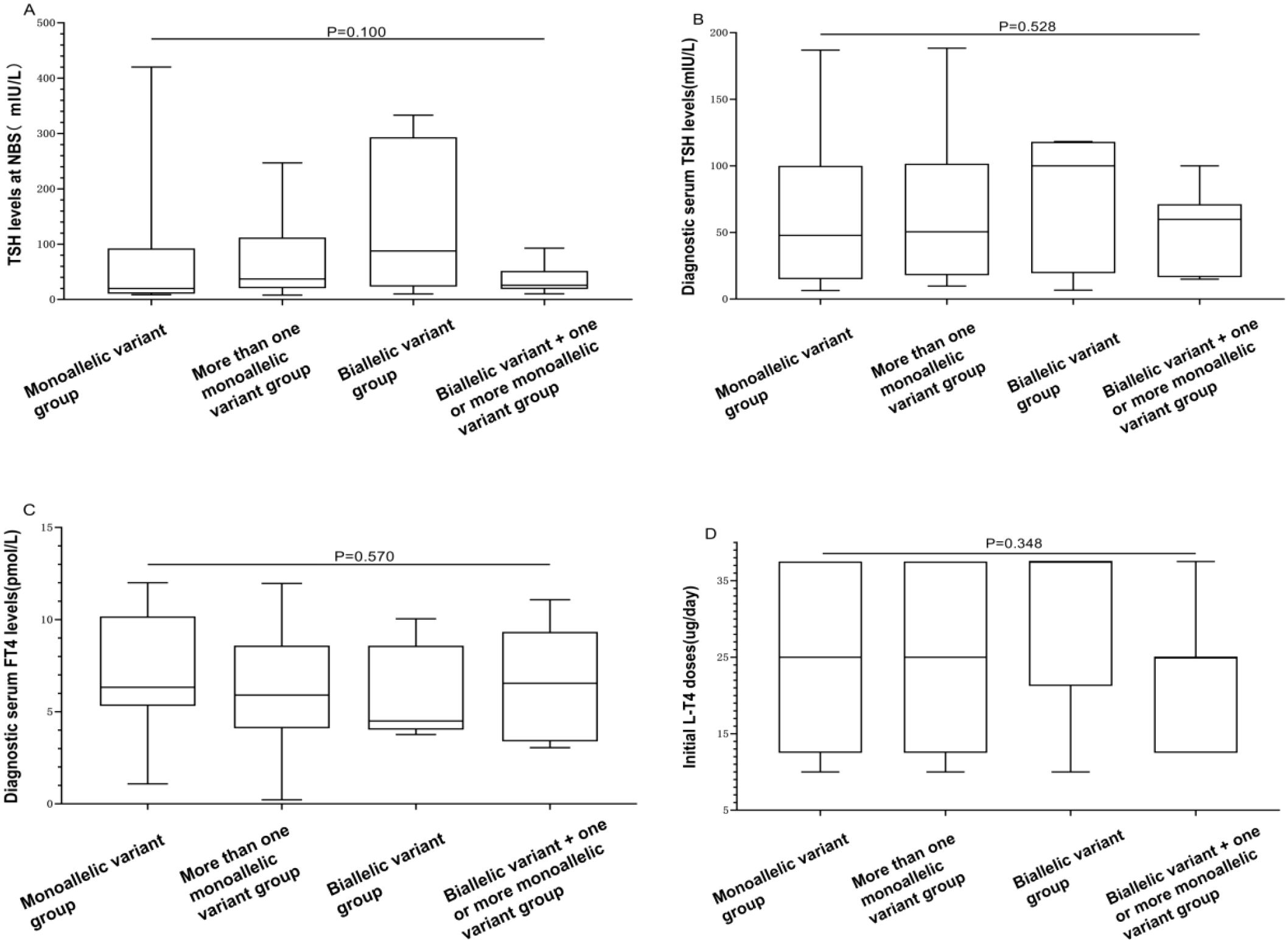 Figure 4. Differences in biochemical results and initial L-T4 doses among “monoallelic variant”, “more than one monoallelic variant”, “biallelic variant”, and “biallelic variant + one or more monoallelic variant” groups. (A) The BOX plot chart illustrates differences among the four groups concerning TSH levels at NBS. (B) The BOX plot chart displays differences among the four groups concerning diagnostic serum TSH levels. (C) The BOX plot chart shows differences among the four groups regarding diagnostic serum FT4 levels. (D) The BOX plot chart demonstrates differences among the four groups regarding the initial L-T4 doses. A P value > 0.05 was considered to indicate no statistically significant difference.