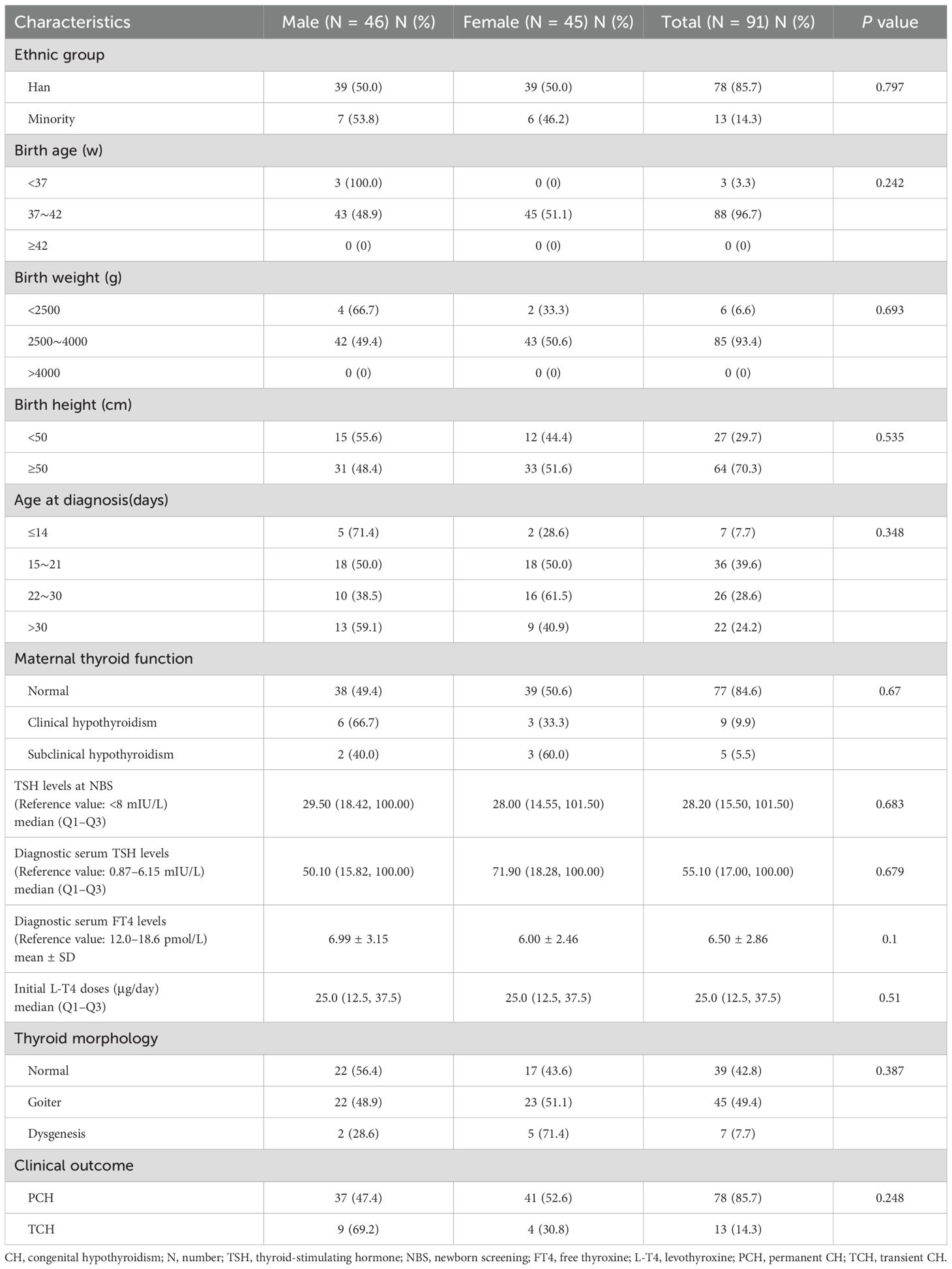 Our cohort comprised a total of 117 patients with CH, 91 of whom were identified as carriers of variations in CH-related genes; these patients included 46 males and 45 females. No statistically significant differences were detected between the male and female patients in terms of ethnic distribution, birth age, birth weight, birth height, age at diagnosis, maternal thyroid function, TSH levels at newborn screening (NBS), diagnostic serum TSH levels, diagnostic serum FT4 levels, initial L-T4 doses, thyroid morphology, or clinical outcome (Table 1).