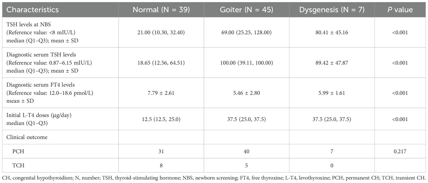 The CH patients were grouped according to thyroid morphology, and we conducted statistical analysis of differences in biochemical test results and clinical outcomes among the groups. We found statistically significant differences (P< 0.001) among the “normal”, “goiter”, and “dysgenesis” groups in terms of TSH levels at NBS, diagnostic serum TSH levels, and diagnostic serum FT4 levels. The “goiter” group and the “dysgenesis” group exhibited higher TSH levels at NBS and diagnostic serum TSH levels, corresponding to lower diagnostic serum FT4 levels. Moreover, the “goiter” group and the “dysgenesis” group required higher initial L-T4 doses than did the “normal” group. However, there was no statistically significant difference in clinical outcomes among the groups (P>0.05) (Table 2, Figure 2).