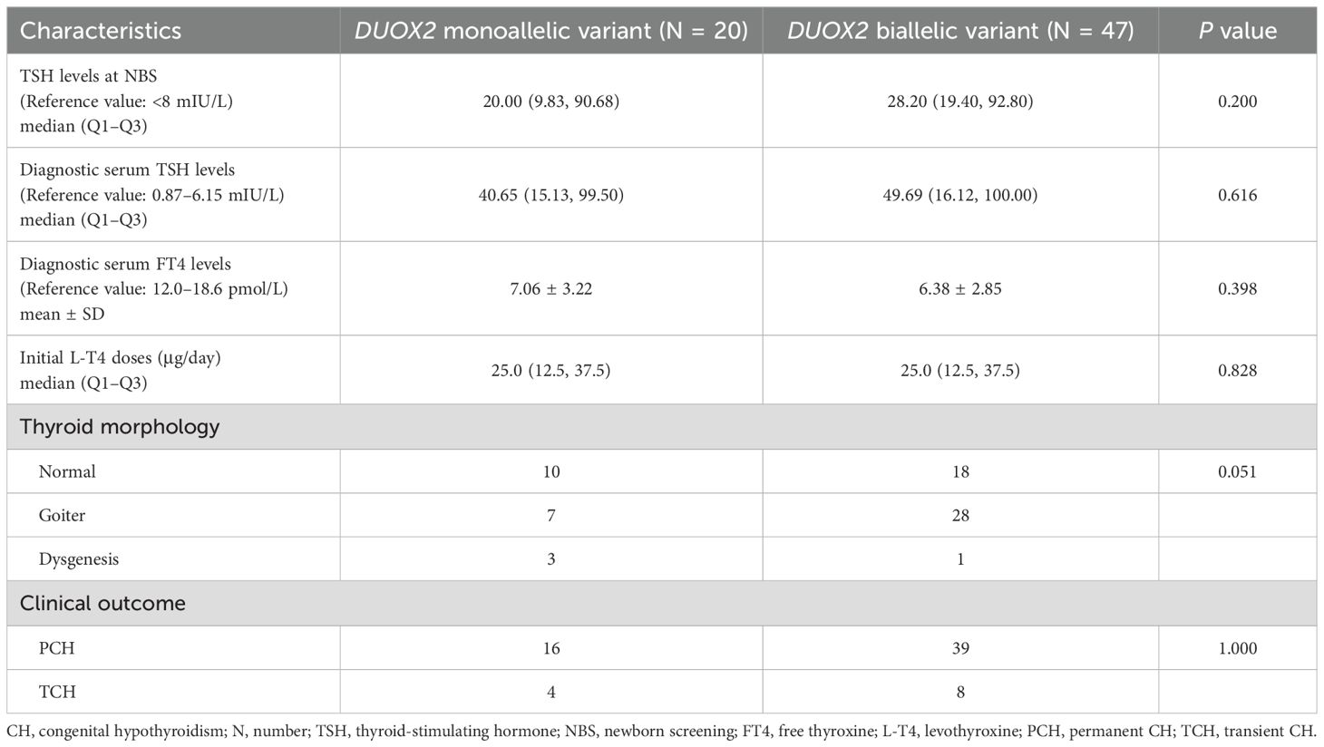 Several studies have proposed that CH patients with monoallelic DUOX2 variants tend to exhibit TCH and that those with biallelic DUOX2 variants are more likely to experience PCH (45). Our findings did not reveal significant differences in biochemical results, initial L-T4 doses, or clinical outcomes between patients with monoallelic and biallelic DUOX2 mutations. However, a significant association was found between DUOX2 biallelic variants and goiter, with monoallelic DUOX2 variants often associated with normal thyroid morphology. The above findings suggest a strong correlation between the quantity of DUOX2 variations and thyroid morphology. How to predict clinical outcomes based on these findings remains highly uncertain.