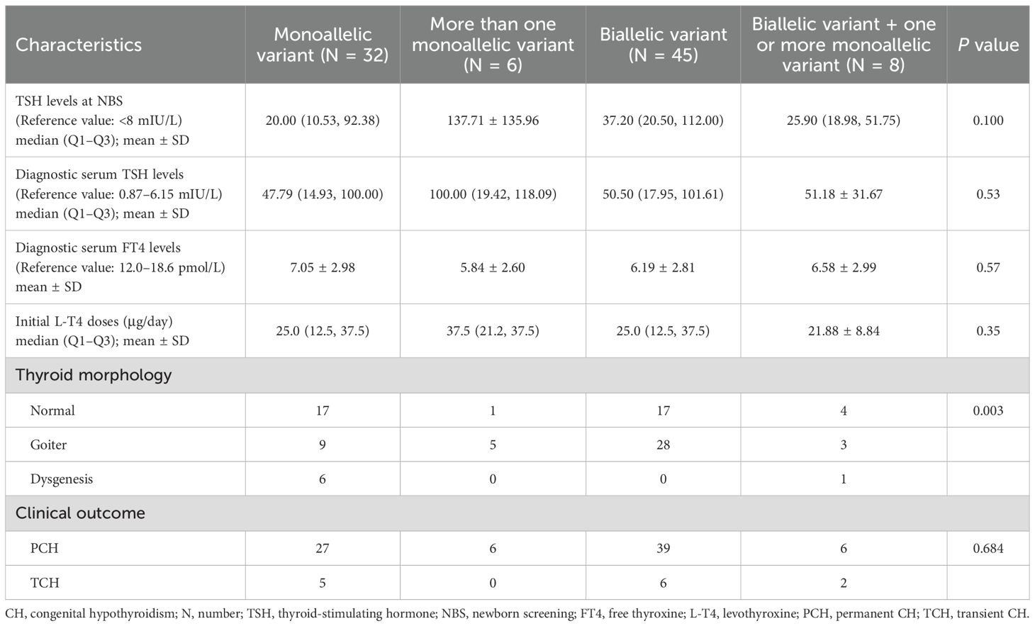 To analyze relationships between genotypes and clinical phenotypes, the 91 CH patients were divided into four groups based on the type of gene variant: those carrying only one monoallelic variant were classified as the “monoallelic variant” group; those with two or more monoallelic variants were in the “more than one monoallelic variant” group; those with only one biallelic variant were in the “biallelic variant” group; and those with one or more monoallelic variants in addition to one biallelic variant were in the “biallelic variant + one or more monoallelic variant” group. The numbers of patients in these four groups were 32, 6, 45, and 8, respectively. There were no significant differences among the four groups in terms of TSH levels at NBS, diagnostic serum TSH levels, diagnostic serum FT4 levels, initial L-T4 doses, or clinical outcomes (P = 0.100, 0.528, 0.570, 0.348, 0.684, respectively). However, there was a significant difference in thyroid morphology among the four groups (P = 0.003). The “monoallelic variant” group had a greater proportion of individuals with “normal” thyroid morphology, accounting for 53.1% (17/32) of the population. With an increase in the number of gene variants, the thyroid morphology gradually shifted toward “goiter” and “dysgenesis” (Table 4, Figure 4).
