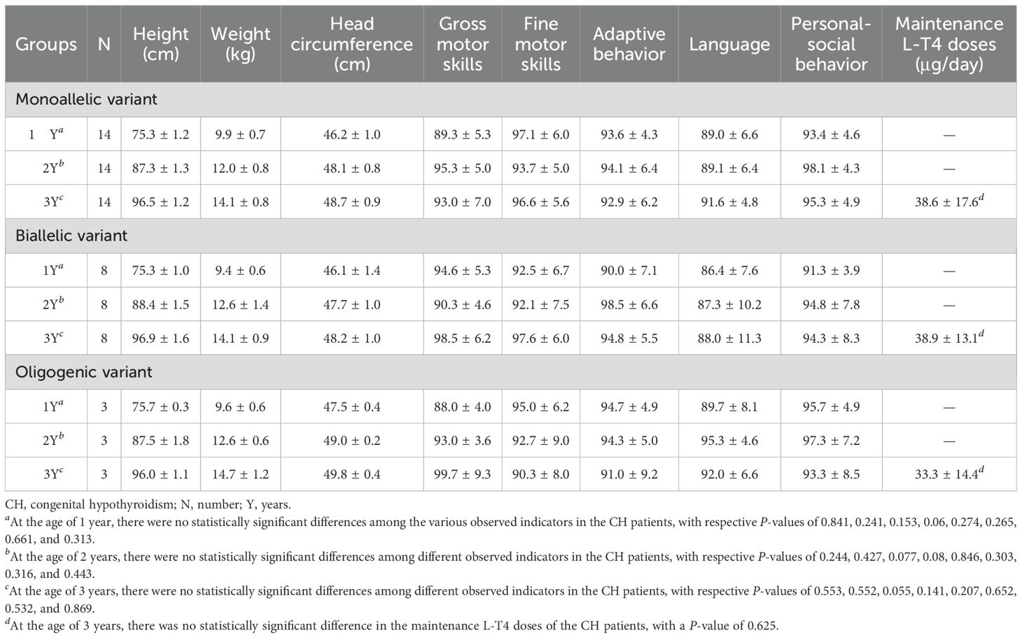 Among the 91 CH patients, 25 underwent standardized physical and intelligence assessments at the ages of 1, 2, and 3 years. The clinical outcomes included 23 cases of PCH and 2 cases of TCH. The physical development (height, weight, head circumference) and intellectual development (gross motor skills, fine motor skills, adaptive behavior, language, and personal-social behavior) of these patients were within the normal range, showing no significant differences compared to those of same-age children. The patients were divided into three groups based on the types of gene variants they carried. At the same monitoring time points, there were no significant differences in the above indicators among the patients with different gene variant types (all P> 0.05). Moreover, no significant differences in L-T4 doses at the maintenance level at the age of 3 years were detected among the three groups (all P> 0.05). A subset of 25 patients had complete standardized follow-up records at 1, 2, and 3 years; others were excluded due to incomplete data or drop-out (Table 5).