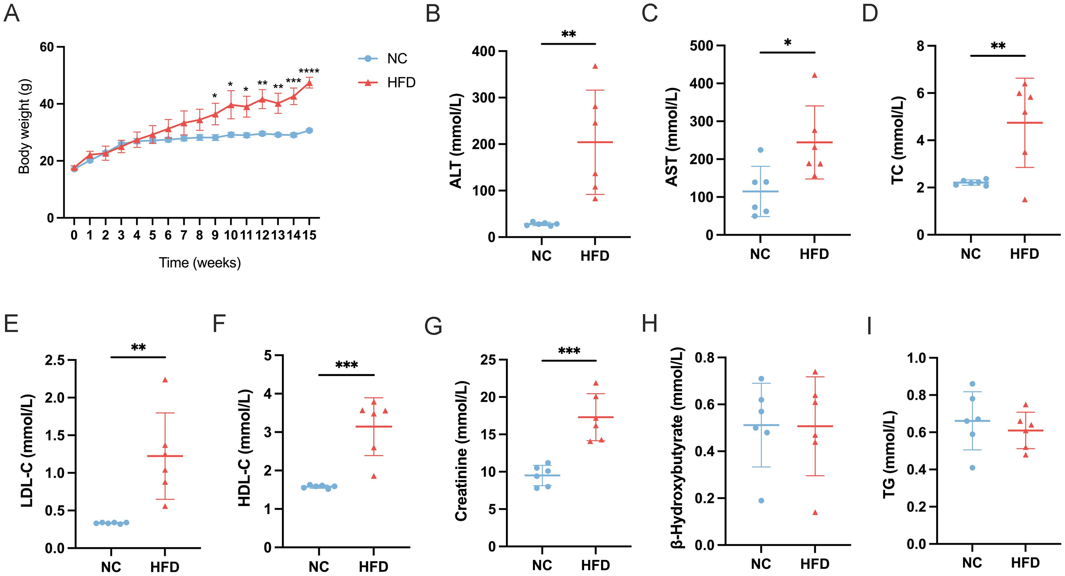 Figure 1. Effects of a high-fat diet (HFD) on body weight and serum biochemical parameters in mice. (A) Body weight progression over 15 weeks in normal chow (NC) and HFD-fed mice (n=6). (B-I) Serum levels of (B) alanine aminotransferase (ALT), (C) aspartate aminotransferase (AST), (D) total cholesterol (TC), (E) low-density lipoprotein cholesterol (LDL-C), (F) high-density lipoprotein cholesterol (HDL-C), (G) creatinine, (H) β-hydroxybutyrate, and (I) triglycerides (TG) in NC and HFD-fed mice. Data are presented as mean ± standard deviation (SD). Statistical significance was determined using an unpaired t-test. *p < 0.05, **p < 0.01, ***p < 0.001, ****p < 0.0001.