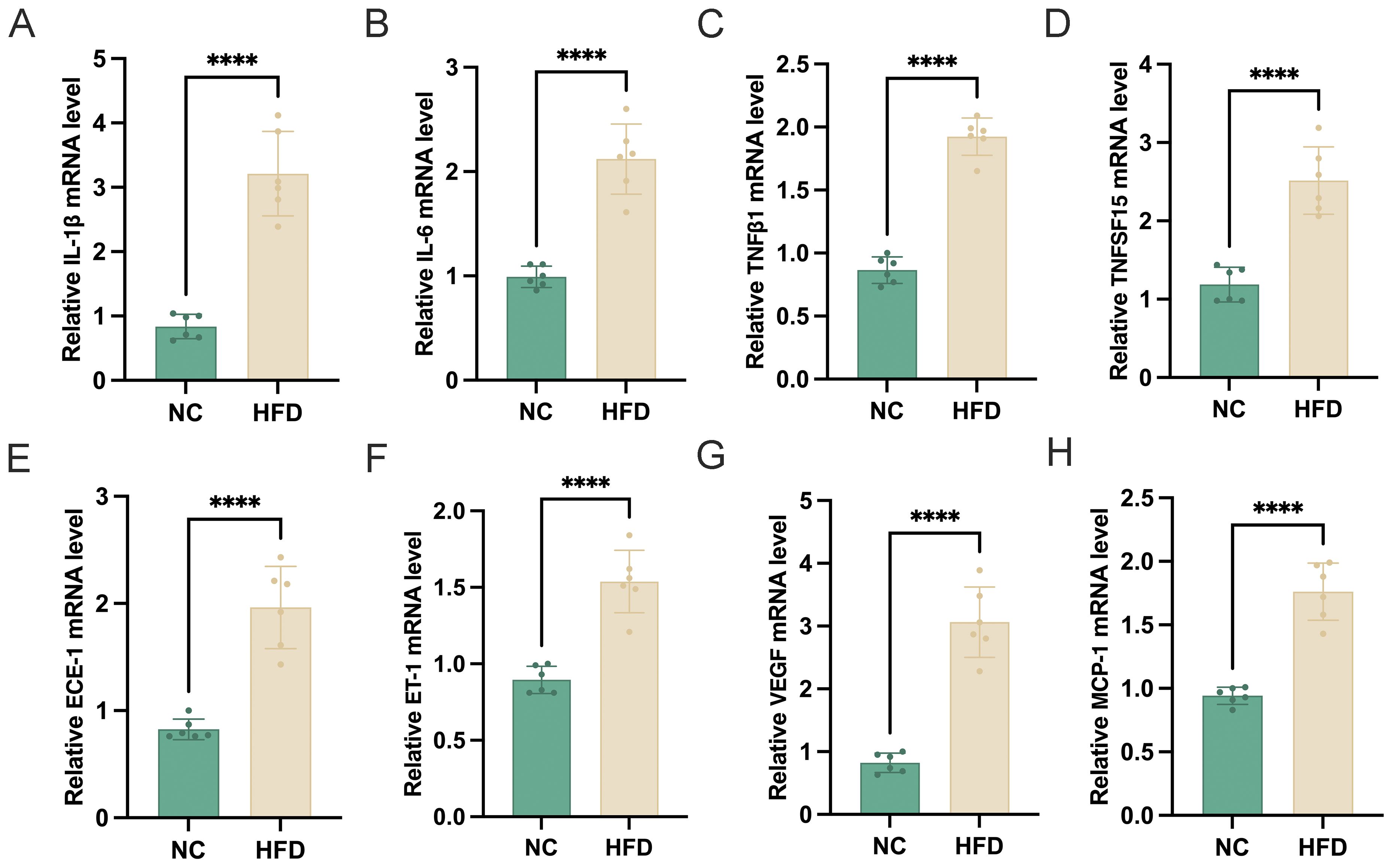 Figure 2. Effects of a high-fat diet (HFD) on retinal mRNA expression of inflammatory and vascular-related genes. (A–H) Relative mRNA expression levels of (A) IL-1β, (B) IL-6, (C) TNFβ1, (D) TNFSF15, (E) ECE-1, (F) ET-1, (G) VEGF, and (H) MCP-1 in the retina of normal chow (NC) and HFD-fed mice (n=6). Gene expression was normalized to an internal control. Data are presented as mean ± standard deviation (SD). Statistical significance was determined using an unpaired t-test. ****p < 0.0001.