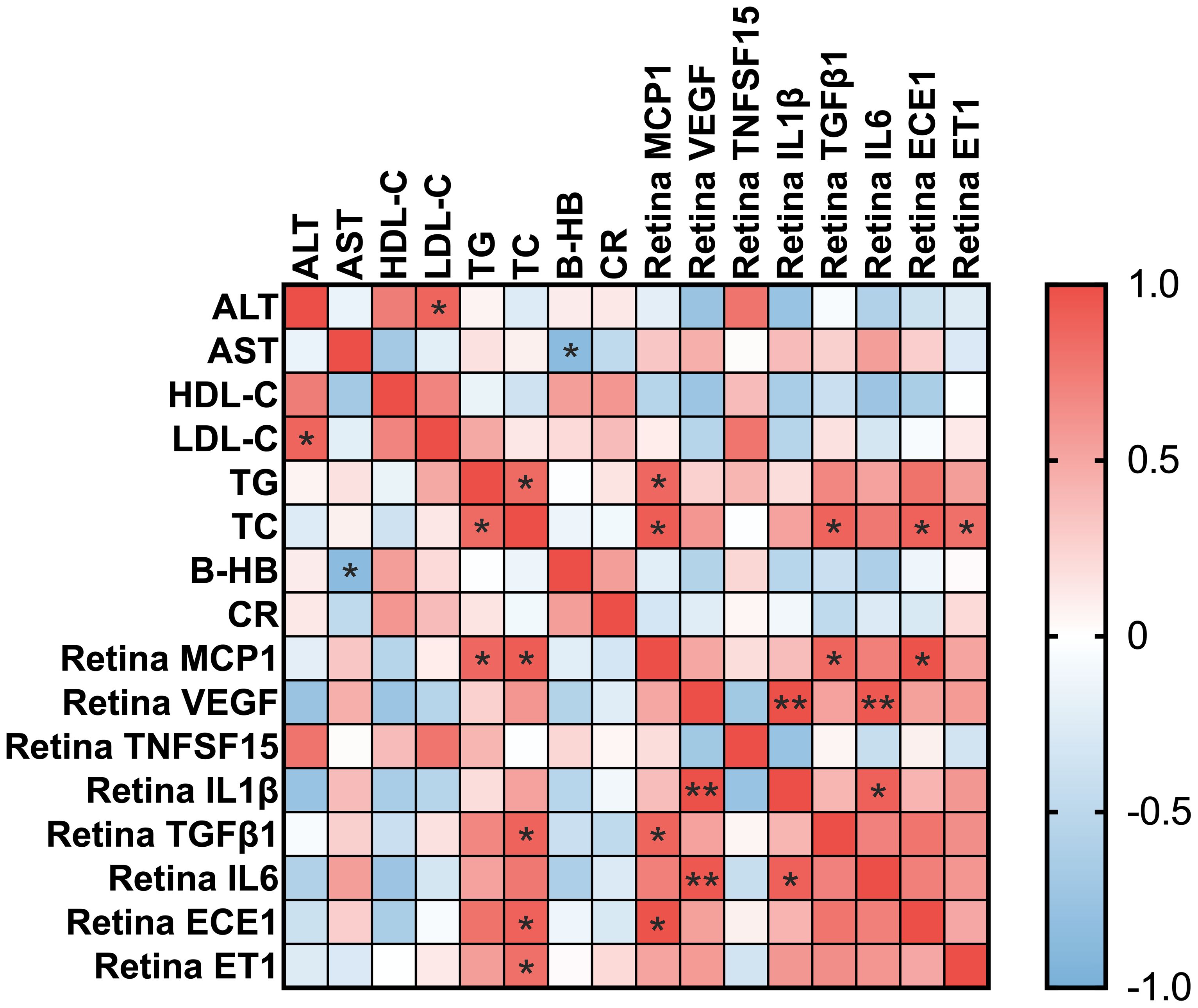 Figure 3. Correlation heatmap between blood parameters and retinal mRNA expression levels. Heatmap showing Pearson correlation coefficients between blood biochemical parameters and retinal inflammatory and vascular-related gene expression. Blood parameters include alanine aminotransferase (ALT), aspartate aminotransferase (AST), high-density lipoprotein cholesterol (HDL-C), low-density lipoprotein cholesterol (LDL-C), triglycerides (TG), total cholesterol (TC), β-hydroxybutyrate (B-HB), and creatinine (CR). Retinal markers include MCP-1, VEGF, TNFSF15, IL-1β, TGFβ1, IL-6, ECE-1, and ET-1. The color scale represents correlation values, with red indicating a positive correlation and blue indicating a negative correlation. * for p<0.05 and ** for p<0.01.