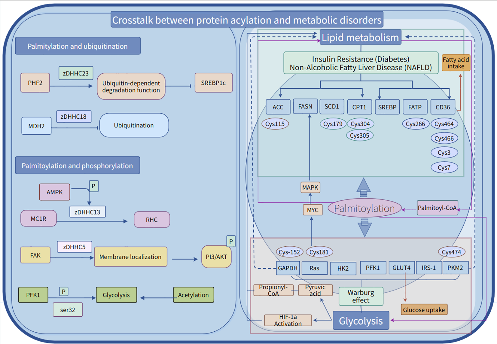 Post-translational modifications (PTMs) of proteins involve the covalent attachment of functional groups to proteins, including ubiquitination, phosphorylation, glycosylation, methylation, acetylation, and glycation. These modifications affect protein stability, localization, and molecular function. Signal molecules within the cell and changes in the environment, such as phosphorylation and ubiquitination, can affect palmitylation (143). Dynamic palmitoylation indirectly affects protein stability by interfering with the ubiquitination process. Ubiquitin ligases can be modified by palmitoylation, such as E3 ubiquitin ligases PHF2 and FBXL2. When PHF2 is palmitoylated by zDHHC23, its ubiquitin-dependent degradation function is enhanced, thereby interfering with the stability of sterol regulatory element-binding protein 1c (SREBP1c) (122). Palmoylated FBXL2 was significantly enriched in the ER (endoplasmic reticulum), which promoted the degradation of IP3R3 through the ubiquitin-mediated pathway (144). zDHHC1 and zDHHC2 mediate lipid raft formation by modifying the Cys17, Cys18, and Cys246 sites of Gpm6a, thereby stabilizing the Procr protein (145); whereas zDHHC4 regulates the ubiquitinisation status of MAVS by modifying its Cys79 site, thereby enhancing stability and activating protein activity (146). The expression of malate dehydrogenase 2 (MDH2) is typically co-regulated by TRIM21-mediated ubiquitination and USP5-mediated deubiquitination. Notably, MDH2 can also be palmitoylated at the Cys138 site by zDHHC18, a modification that inhibits its ubiquitination and thereby enhances its stability (147). Palmitoylation anchors proteins to the membrane, and phosphorylation can further regulate their activity, Ras proteins require palmitoylation for localization, and then transmit signals through downstream effectors via phosphorylation.zDHHC7 catalyzes the palmitoylation of the STAT3 protein at the Cys108 residue, guiding its localization to the cell membrane rather than the nucleus. This process not only promotes the activation and phosphorylation of STAT3 but also enhances its interaction with proteins such as JAK2. In contrast, APT2 regulates phosphorylated STAT3 (p-STAT3) and facilitates its transport into the cell nucleus (148). In the crosstalk between phosphorylation and palmitoylation, G protein-coupled receptors (GPCRs) play a crucial role. Post-translational modifications of GPCRs specifically occur between phosphorylation and palmitoylation. Palmitoylation forms the fourth intracellular loop (ICL) of GPCRs through membrane insertion, a process that affects not only the receptor structure but also serves as the primary domain for phosphorylation sites. In fact, studies have shown that defects in palmitoylation significantly impair the phosphorylation process of various GPCRs (149). Palmitoylation modification at the C341 site can modulate PKA-dependent C-terminal phosphorylation and receptor responsiveness (150, 151). Similar phenomena have been reported for the 5-hydroxytryptamine (5-HT4) receptor: mutant forms that lack palmitoylation exhibit enhanced receptor phosphorylation levels both in the basal state and following norepinephrine stimulation (152). Furthermore, in vitro experiments have further confirmed that certain G protein-coupled receptors (GPCRs) lacking palmitoylation are more prone to phosphorylation. Studies on de-palmitoylated adrenergic receptors and rhodopsin have also found significantly elevated levels of phosphorylation in these receptors (153). Palmitoleylation is closely related to lipid metabolism and depends on palmitoleoyl-CoA, regulating ACC (acetyl-CoA carboxylase, Cys115), carnitine palmitoyltransferase 1 (Cys305), and CD36 (Cys3, Cys7), among other key lipid metabolic enzymes and signaling molecules. This affects the balance between fatty acid synthesis and oxidation, potentially leading to conditions such as insulin resistance and non-alcoholic fatty liver disease (NAFLD). Additionally, palmitoylation participates in glycolysis by modifying key enzymes or regulatory proteins, such as glyceraldehyde-3-phosphate dehydrogenase (Cys152, Cys247), pyruvate kinase 2 (Cys474), leading to metabolic reprogramming issues such as the Warburg effect, which affects cellular energy metabolism, signal transduction, and disease onset. Palmitylation serves as a cross-regulatory hub for glycolysis and lipid metabolism, A complex regulatory network is constructed between glycolysis and lipid metabolism, which affects cellular energy metabolism balance, signal transduction and disease occurrence. Its dynamic modifications are crucial in the context of diabetes, fatty liver disease, cancer, and various other conditions, making it a potential target for metabolic therapies (Figure 4).
