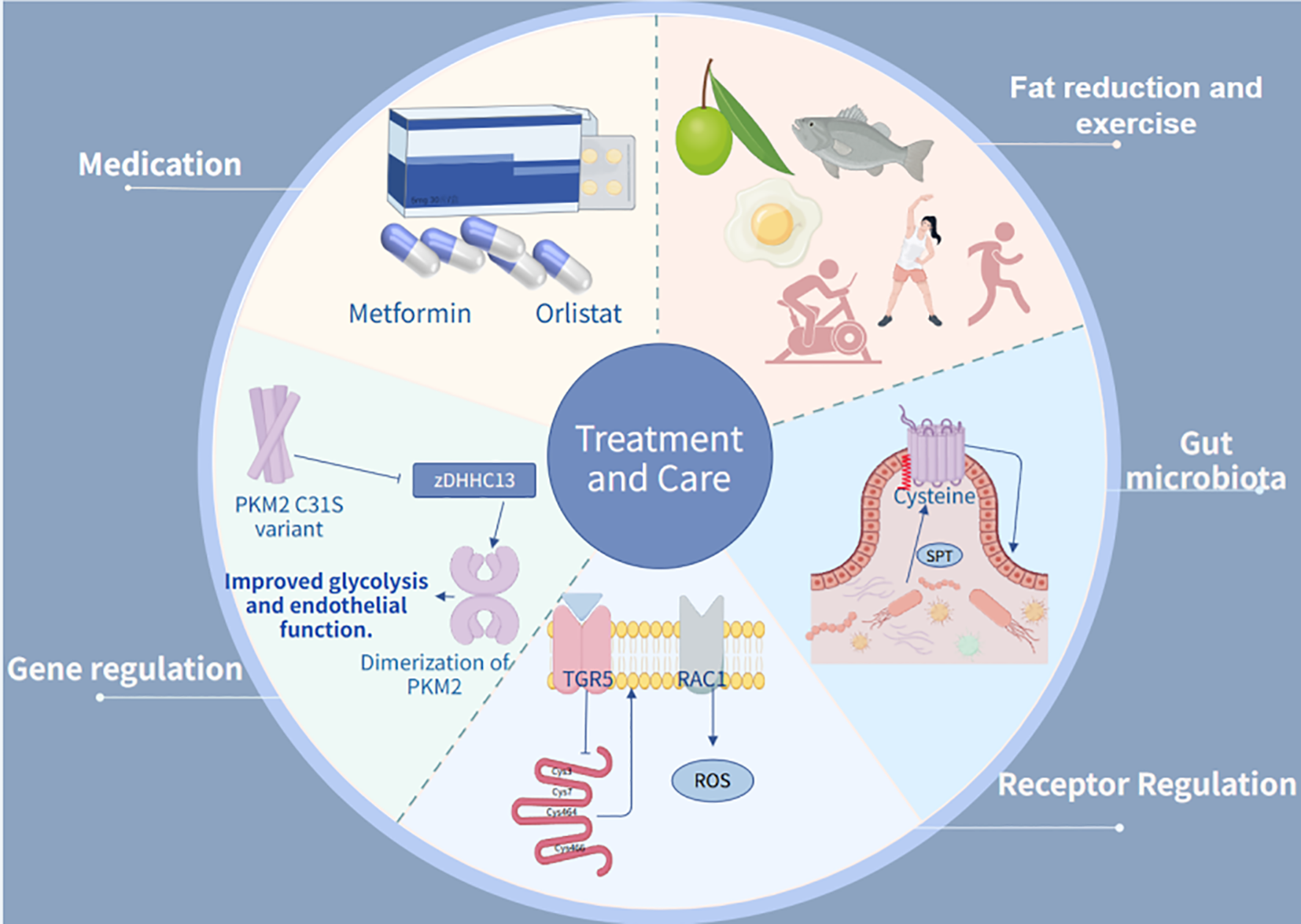 The treatment integrates therapeutic and maintenance approaches. In pharmacological management, Metformin and Insulin are employed as primary antidiabetic and lipid-lowering agents. Regarding receptor regulation, TGR5 activation is utilized to reduce fatty acid uptake. For genetic intervention, experimental studies focus on PKM2 C31S mutations. In terms of gut microbiota, serine palmitoyltransferase (SPT)-catalyzed palmitylation reactions are applied.