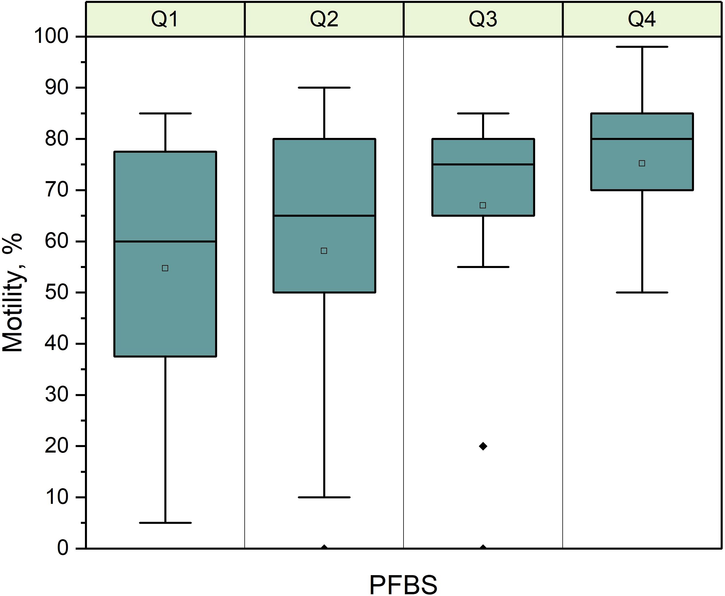 Figure 1. Samples divided by quartiles of PFBS exposure vs sperm motility (%). There was a significantly increased motility (%) with higher PFBS exposure (p=0.03).
