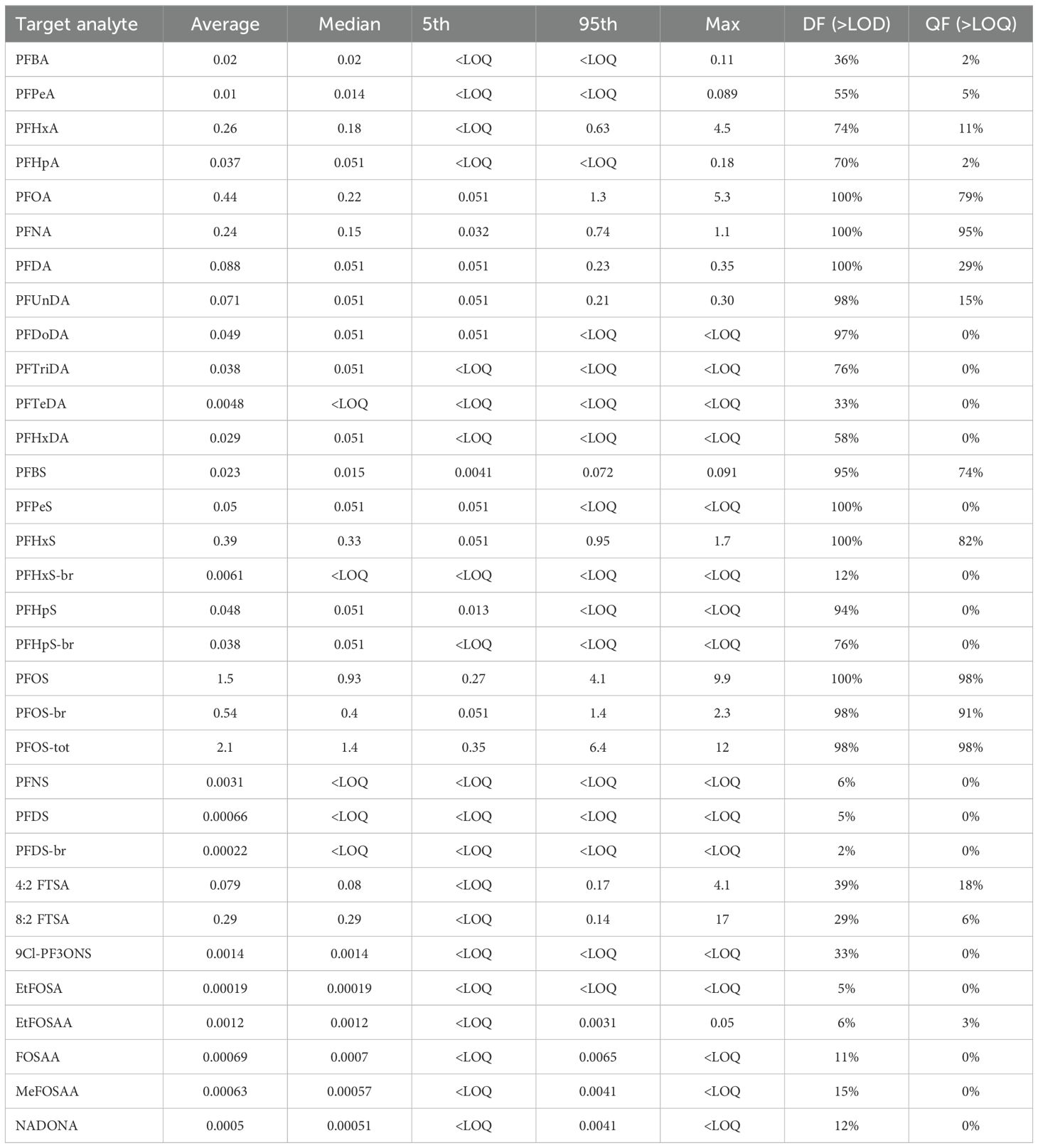 Only compounds found above the LOD (detection frequency [DF] > 0%) in at least one dog serum sample are reported in the result tables (Supplementary Table S4). These are 24 validated PFAS and 7 semi-quantified PFAS (PFPeS, PFHxS-br, PFHpS, PFHpS-br, PFOS-br, PFNS, PFDS-br). Further, 15 PFAS were quantified (quantification frequency [QF] > 0%) in dog serum (Supplementary Table S4).