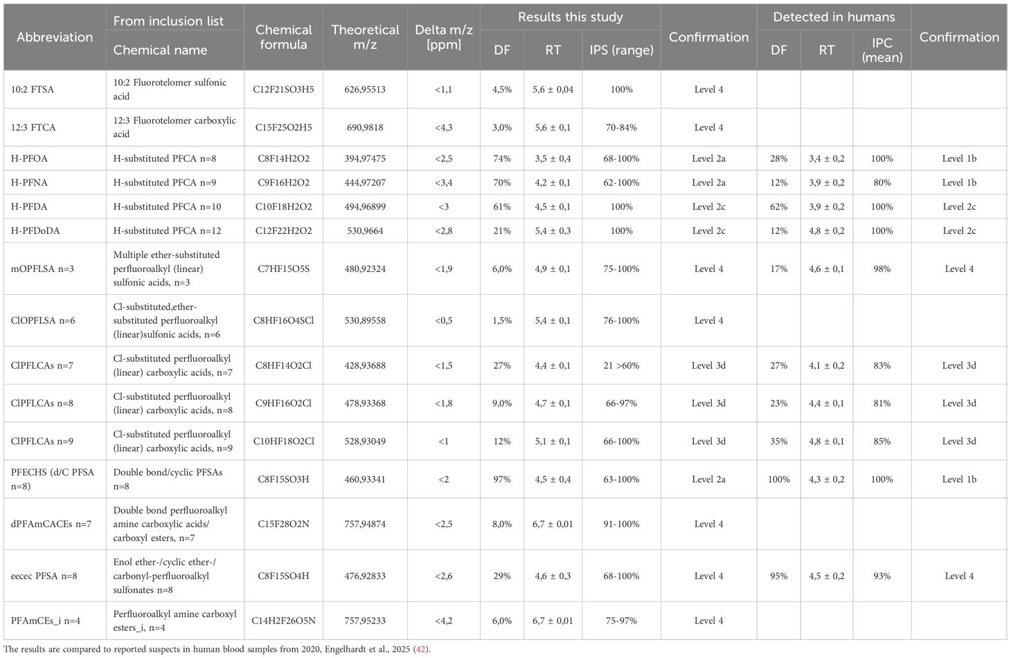 Table 2. Detected suspect features (abbreviation and chemical name), with detection frequencies (DF), chemical formula (neutral), theoretical mass to charge (m/z), m/z difference within the samples (delta m/z), retention time (RT), isotopic pattern score (IPS) and level of confirmation according to Charbonnet et al., 2022 (41).