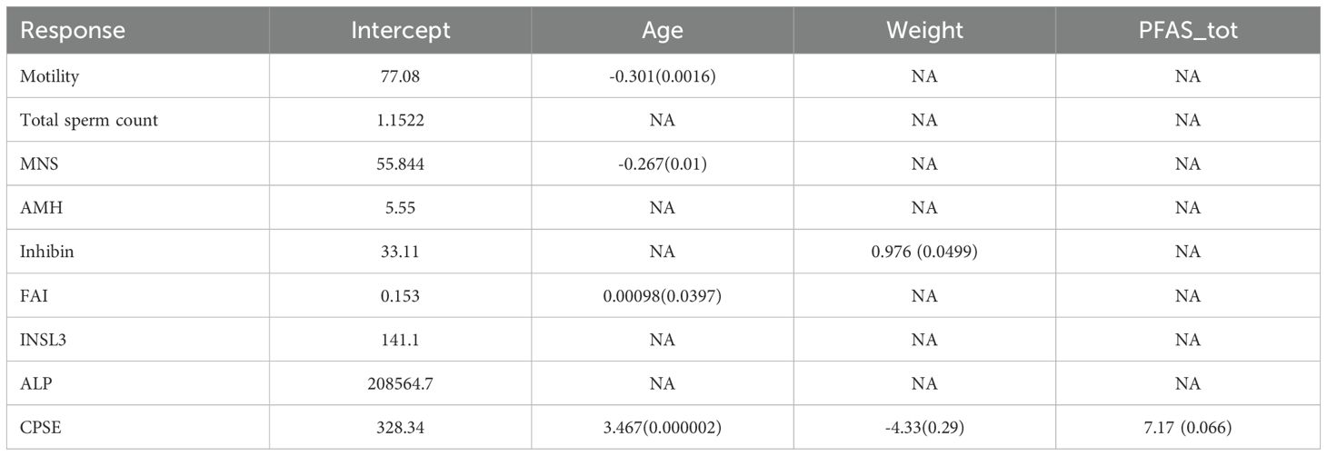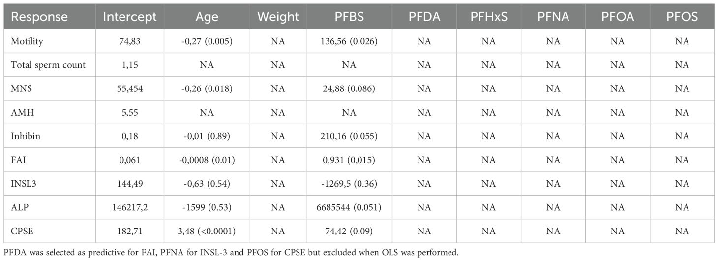 Table 4. LASSO regression analysis investigating the association between total PFAS exposure semen quality, endocrine biomarkers including possible confounders Age, Weight. Estimates (p-values), where NA indicate variables with no significant predictive value.
