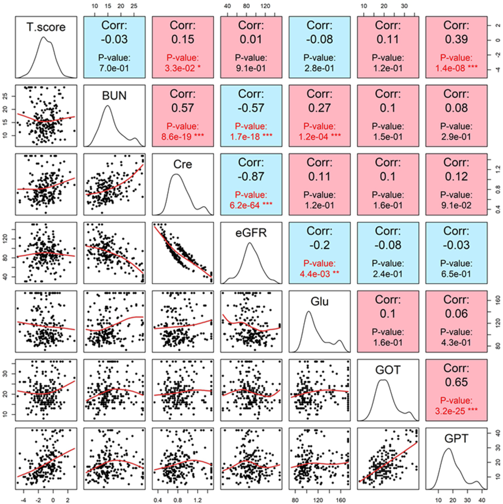 Pairwise correlation plots between T-score and key biochemical parameters including renal (creatinine, eGFR, BUN), hepatic (GOT, GPT), and glucose indices. GPT showed the strongest positive correlation with T-score (r = 0.39, p=1.4e-8), while creatinine was inversely correlated (r = 0.15, p =3.3e-2). These associations underscore the interplay between metabolic function and bone density in the studied population.