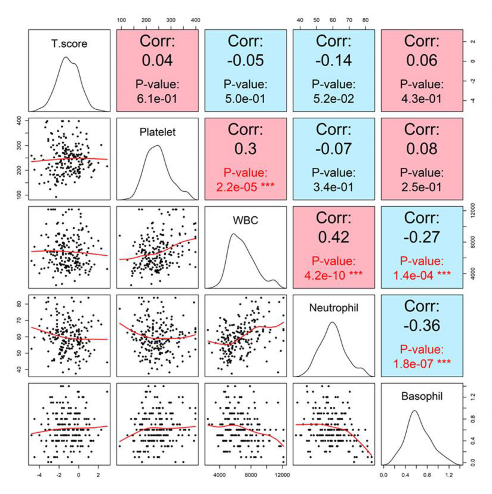 Correlation matrix with lumbar spine T-score. Pairwise scatterplots and Pearson correlation coefficients between T-score and hematologic markers, including white blood cell count (WBC), neutrophils, basophils, and platelets. None of the markers demonstrated statistically significant correlations with T-score. Specifically, WBC showed a very weak negative correlation (r = -0.05, p = 0.50), platelet showed a weak positive correlation (r = 0.04, p = 0.61), neutrophil showed a weak negative correlation (r = −0.14, p = 0.052), and basophil showed a weak positive correlation (r = 0.06, p = 0.43).