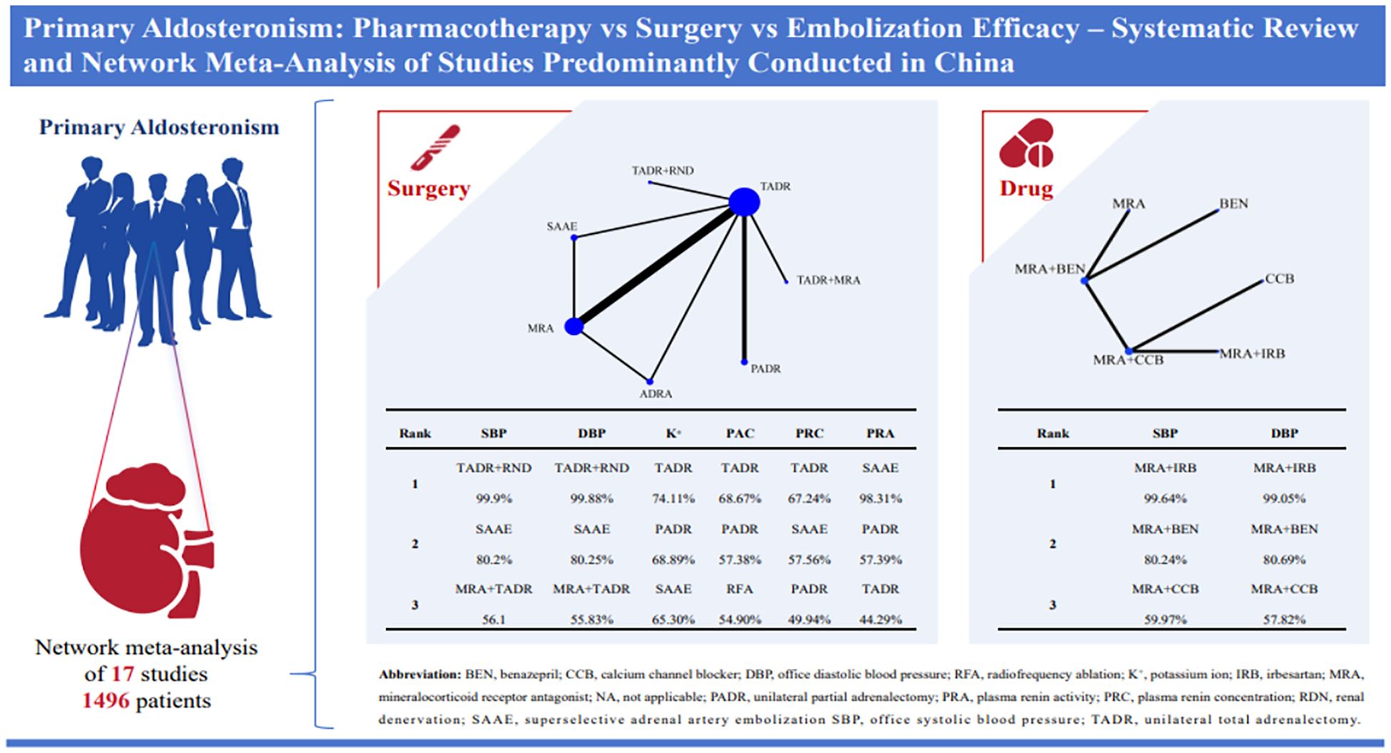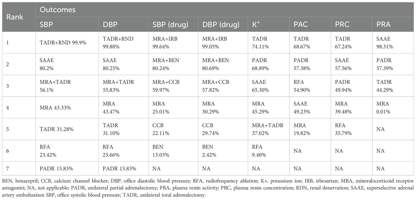 This study compared the efficacy of pharmacotherapy, TADR, PADR RFA, and SAAE in lowering blood pressure and improving biochemical indicators in patients with PA. The results of this study showed that TADR plus RND had the best antihypertensive efficacy in surgical treatment, whereas MRAs plus IRB showed the best efficacy among pharmacological treatments.