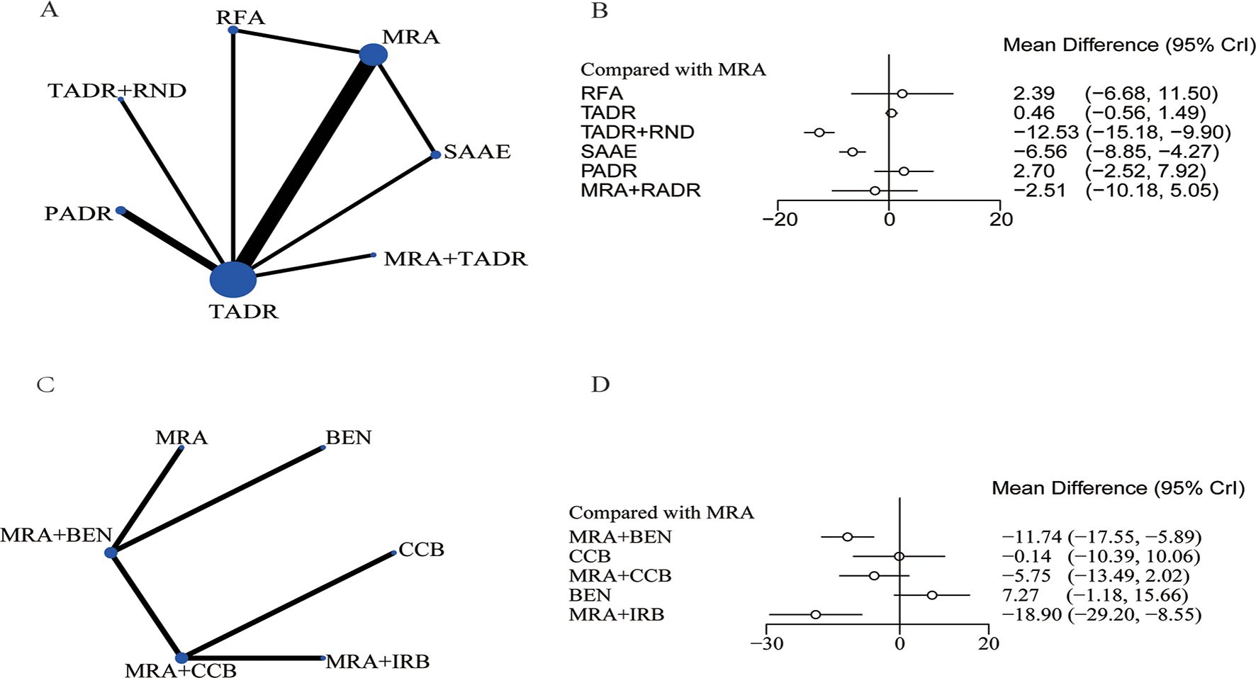 Conclusions: This study showed TADR + RND and MRAs + IRB had best efficacy in surgical and pharmacological treatments, respectively, but 76% of the included studies were conducted in China, which may affect the generalizability of the findings. Therefore, the results need further validation.