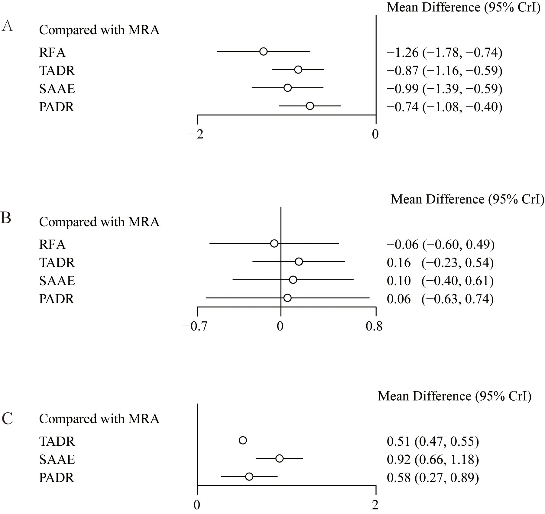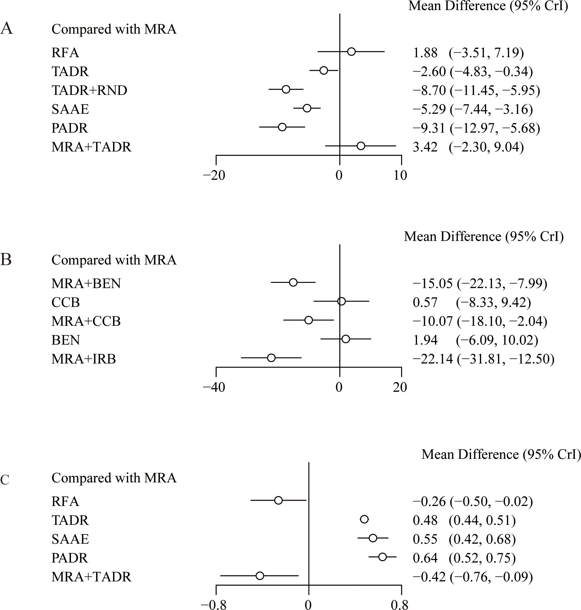 Figure 4. Effect sizes of various treatments relative to MRAs, (A) Plasma Aldosterone Concentration (PAC); (B) Plasma Renin Concentration (PRC); (C) Plasma Renin Activity (PRA).