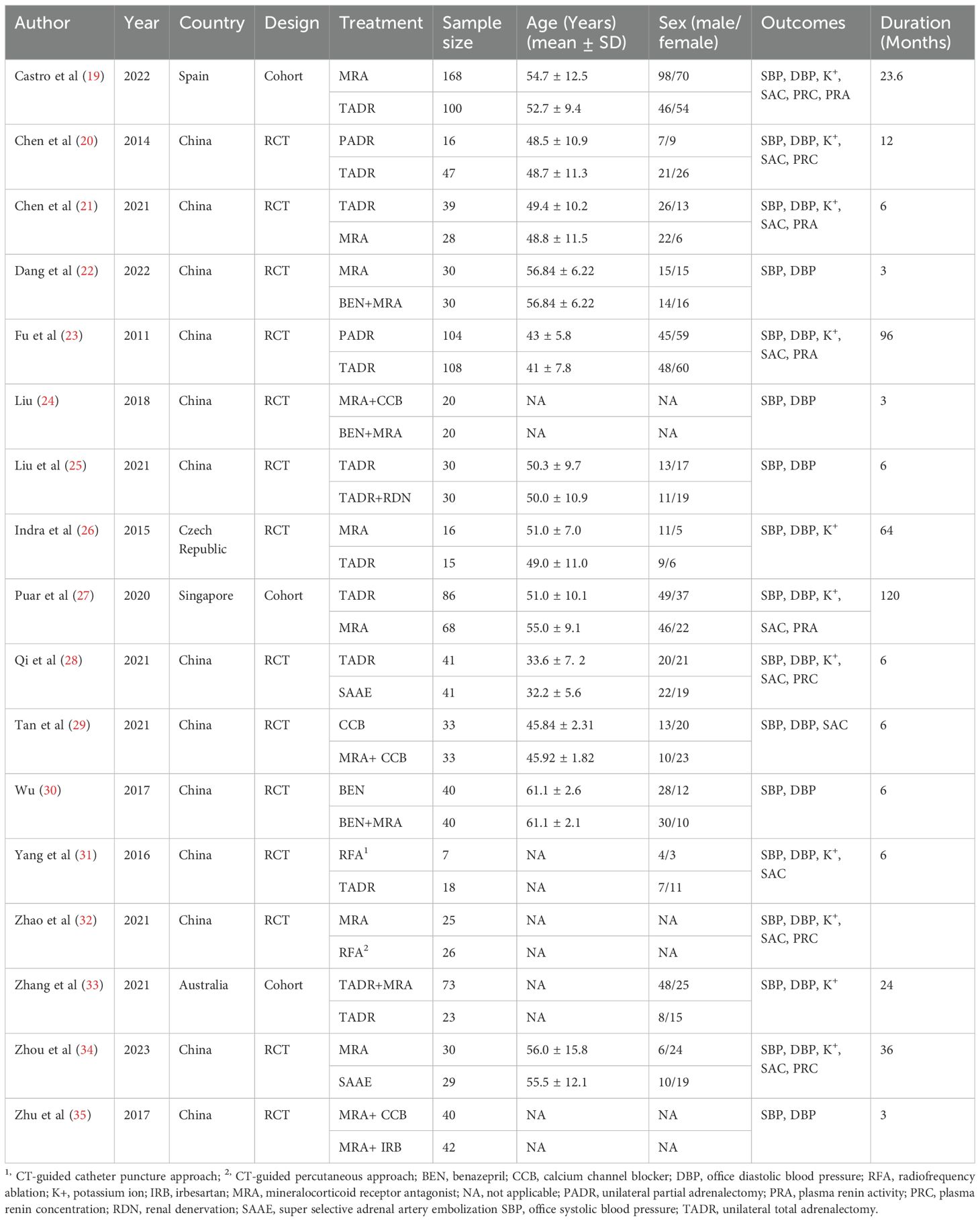 A total of 8128 studies were retrieved, with 3545 of them remaining after automatic removal of duplicates by EndNote 21. After further screening of titles and abstracts, a total of 51 studies were advanced to full-text review. Thirty-six of these did not satisfy the inclusion criteria, and two additional studies were located through hand-searching. Finally, 17 with 1496 participants were ultimately included in the analysis (19–35), as detailed in Figure 1. Of these studies, 13 (76%) were conducted in China, 14 (82%) were RCTs, and the remaining 3 were cohort studies. This study involved a total of six surgical treatments and four pharmacologic treatments. Surgical treatments included RFA, unilateral partial adrenalectomy (PADR), unilateral total adrenalectomy (TADR), SAAE, TADR plus MRAs, and TADR plus RDN. Pharmacologic treatments involved MRAs, calcium channel blockers (CCBs), benazepril (BEN), irbesartan (IRB) and their combinations. The main characteristics of the included studies are shown in Table 1. Detailed information on drug regimens and dosages, when available, is summarized in Supplementary Table S3.