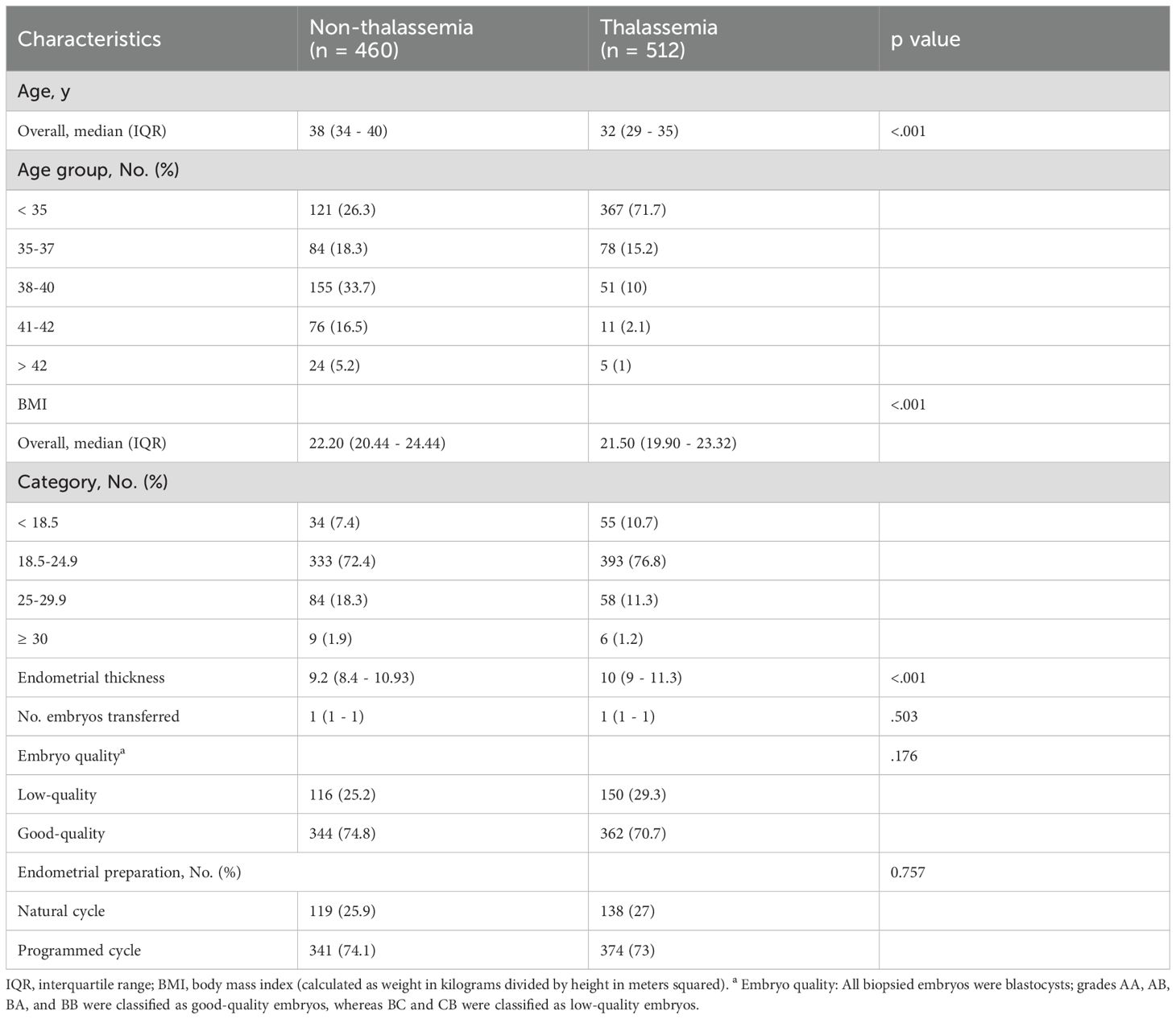 A total of 981 women who underwent euploid embryo transfer were included in this study. Patients were categorized into two groups based on thalassemia status: the non-thalassemia group (n = 460) and the thalassemia group (n = 512). The median age of patients in the non-thalassemia group was 38 years (IQR: 34–40), significantly higher than that of the thalassemia group, which was 32 years (IQR: 29–35) (p < 0.001). Age distribution further revealed that 71.7% of patients in the thalassemia group were under 35 years old, compared to only 26.3% in the non-thalassemia group. Conversely, a higher proportion of patients aged 38 years or older was observed in the non-thalassemia group (55.4% vs. 13.1%). In terms of BMI, the median BMI in the thalassemia group was 21.50 (IQR: 19.90–23.32), significantly lower than that in the non-thalassemia group (22.20, IQR: 20.44–24.44) (p < 0.001). A higher proportion of patients with BMI < 18.5 was noted in the thalassemia group (10.7% vs. 7.4%), while the proportion of patients with BMI ≥ 25 was lower. Additionally, the median endometrial thickness was significantly greater in the thalassemia group (10.0 mm vs. 9.2 mm, p < 0.001). There were no significant differences between the two groups regarding the number of embryos transferred (median = 1), embryo quality (approximately 70% high-quality embryos), or endometrial preparation methods (Table 1).