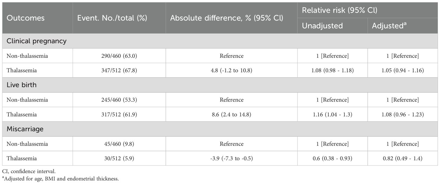 To further investigate potential differences in live birth outcomes, we analyzed the “conditional live birth rate,” defined as the proportion of live births among those with clinical pregnancies. The rate was significantly higher in the thalassemia group (91.4%) compared to the non-thalassemia group (84.5%). The unadjusted relative risk was 1.08 (95% CI: 1.02–1.15), but the adjusted analysis showed no significant difference (aRR = 1.04, 95% CI: 0.97–1.11).