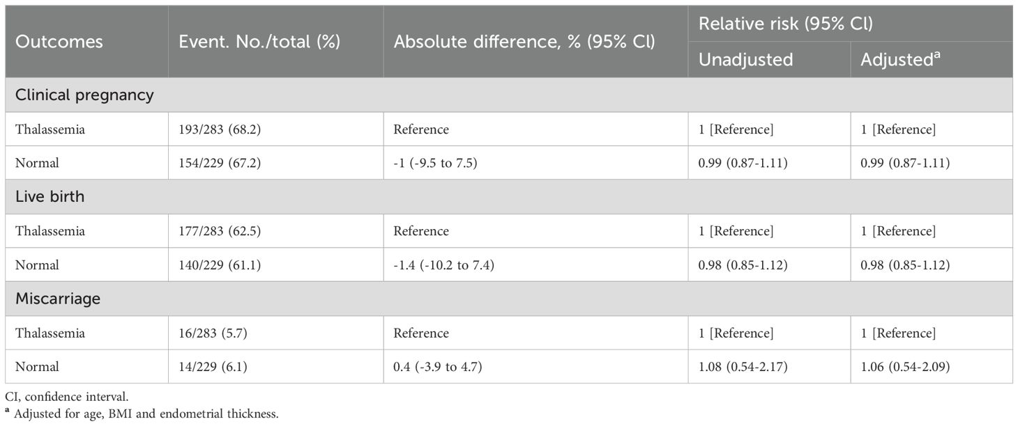 Table 2. Comparison of clinical pregnancy, live birth, and miscarriage outcomes after euploid embryo transfer between women with and without thalassemia.