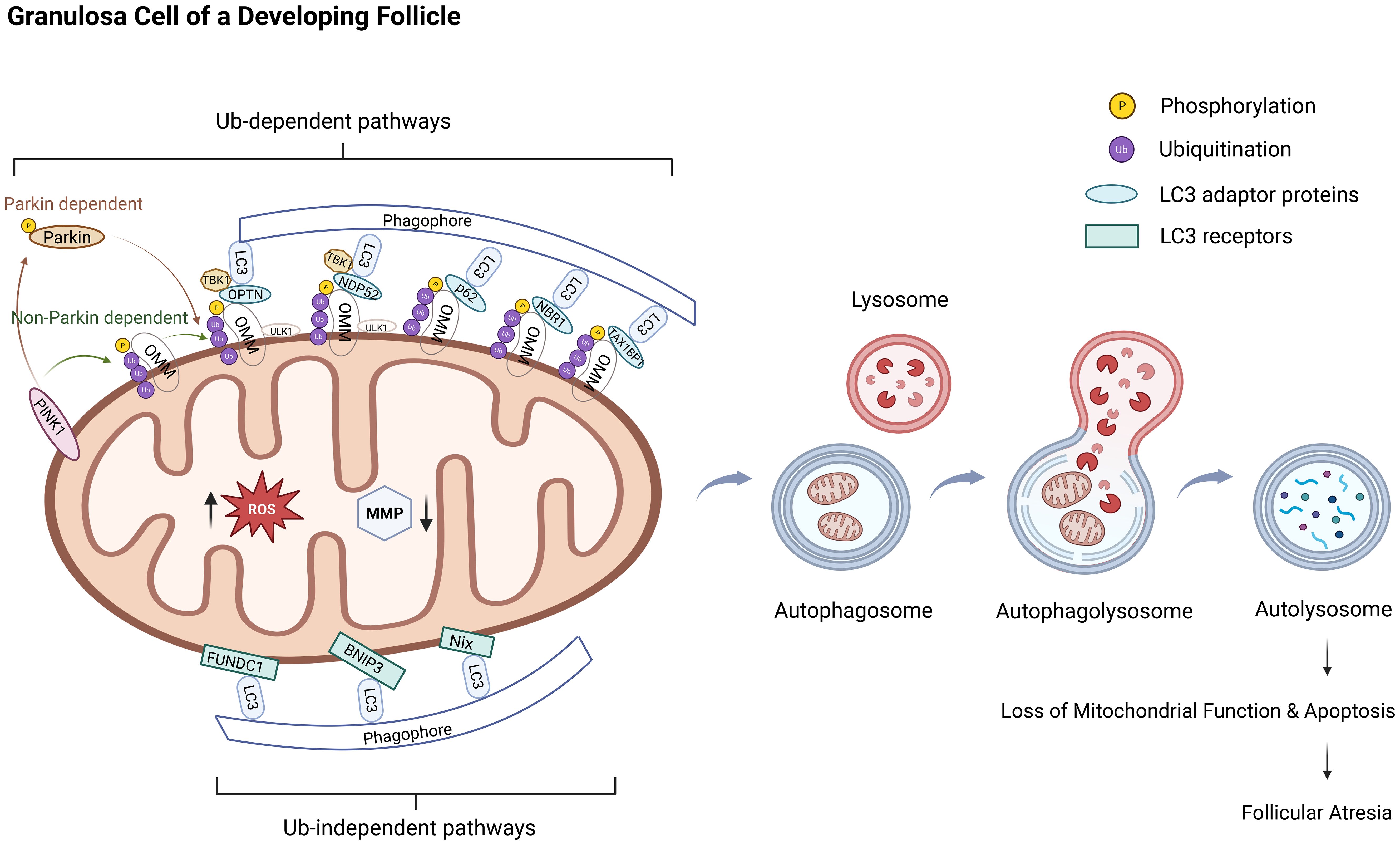 Figure 1. Excessive mitophagy in granulosa cells leads to follicular atresia. The molecular mechanism and progression of mitophagy involve two major pathways: the ubiquitin-dependent pathway and the ubiquitin-independent pathway. The PINK1/Parkin pathway represents a canonical example of the ubiquitin-dependent mitophagy mechanism. Under pathological conditions, such as oxidative stress, mitochondrial membrane depolarization results in the stable accumulation of PINK1 on the outer mitochondrial membrane, where it undergoes autophosphorylation and becomes activated. Activated PINK1 phosphorylates ubiquitin molecules, which facilitates the recruitment of cytosolic Parkin to the mitochondrial surface and activates its E3 ubiquitin ligase activity through phosphorylation. Parkin then catalyzes the assembly of ubiquitin chains on mitochondrial surface proteins, thereby labeling damaged mitochondria for selective degradation and establishing a positive feedback loop that amplifies the mitophagy signal. Ubiquitin-binding autophagy receptors, including OPTN, NDP52, p62, NBR1, and TAX1BP1, recognize these ubiquitinated proteins and bridge the interaction with LC3-positive autophagosomal membranes, thereby mediating the selective engulfment and lysosomal degradation of impaired mitochondria. In contrast, the ubiquitin-independent pathway primarily relies on the direct interaction between mitochondrial outer membrane proteins, such as Nix, BNIP3, and FUNDC1, and LC3 or its homologs to initiate mitophagy. The overall process of mitophagy can be delineated into four sequential stages: initiation, sequestration of dysfunctional mitochondria via autophagosome formation, fusion of autophagosomes with lysosomes, and degradation of mitochondrial components within autolysosomes to ensure the elimination of damaged mitochondria. This schematic illustrates the pathogenic cascade through which excessive mitophagy, driven by oxidative stress, triggers follicular atresia in ovarian granulosa cells. The dysregulation of this quality-control mechanism leads to uncontrolled mitochondrial clearance, culminating in bioenergetic failure and the initiation of apoptosis. The subsequent extensive loss of granulosa cells directly drives follicular degeneration.Ub: ubiquitin, Parkin: PARK2 gene-encoded protein, PINK1:PTEN-induced putative kinase 1, ROS: reactive oxygen species, MMP/ΔΨm: mitochondrial membrane potential, LC3: Microtubule-Associated Protein 1 Light Chain 3, OMM: outer mitochondrial membrane, OPTN: optineurin, NDP52: nuclear dot protein 52, SQSTM1/P62: sequestosome-1, NBR1: BRCA1-associated protein 1, TAX1BP1: TAX1-binding protein 1, TBK1:TANK-Binding Kinase 1, BNIP3L/Nix: Bcl-2 interacting protein 3-like, BNIP3: Bcl-2 interacting protein 3, FUNDC1: FUN14 domain-containing 1.