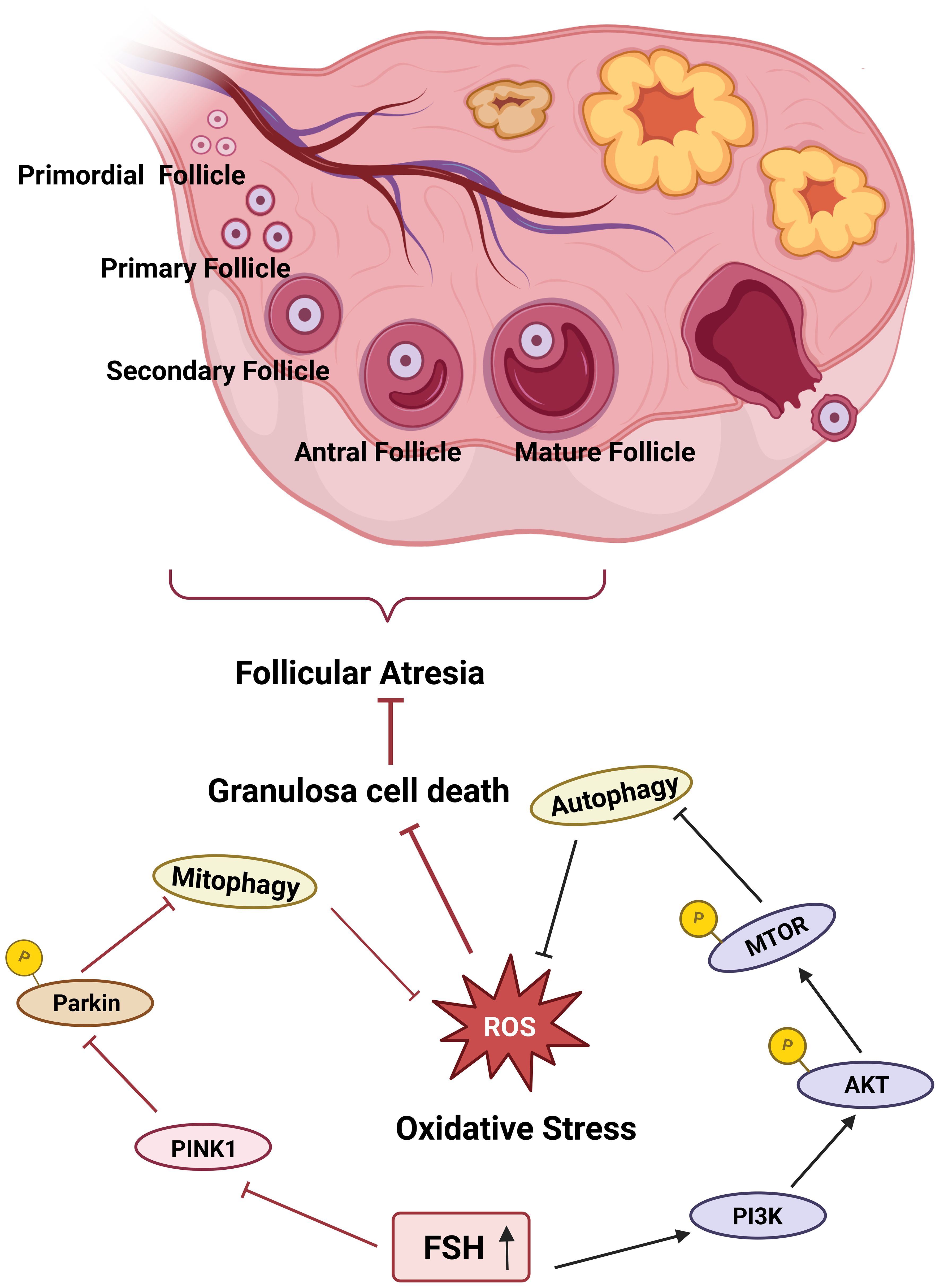 At the end of the ovarian cycle, most follicles that do not undergo ovulation eventually undergo atresia and degenerate, with 99% of all follicles being subject to this process (53). In mammalian embryos, atretic follicles begin to develop as early as six weeks of gestation in utero. Atresia can occur at any stage of follicular development; however, it is most prevalent during the AF stage. The apoptosis of GCs represents the primary cause of follicular atresia. Oxidative stress plays a critical role in GC-induced follicular atresia. Follicle-stimulating hormone (FSH) protects GCs, which are highly sensitive to ROS, from undergoing apoptosis and reduces GC mortality. Specifically, FSH inhibits PINK1 expression, prevents Parkin translocation to mitochondria, suppresses excessive mitophagy activation, and thereby maintains GC viability (54) (Figure 1). Furthermore, FSH can activate the phosphoinositide 3-kinase (PI3K)-AKT-mechanistic target of rapamycin (MTOR) pathway. The PI3K-AKT-MTOR pathway is a crucial pathway for the downregulation of autophagy. By suppressing excessive autophagy, it protects GCs in an oxidative damage milieu and facilitates ovulation (Figure 2). Mitophagy exhibits bidirectional regulatory properties. In this respect, Li et al. demonstrated that under hypoxic conditions, FSH activates the mitophagy pathway, leading to upregulated expression of Parkin, PINK1, and PTEN, which in turn inhibits germ cell apoptosis. This indicates that mitophagy is not merely a simple on/off mechanism. In the context of female reproduction, the tissue-specific characteristics and molecular signaling intensity thresholds associated with the bidirectional regulation of mitophagy warrant further investigation, as they may be closely linked to the clinical therapeutic window for reproductive disorders (55).