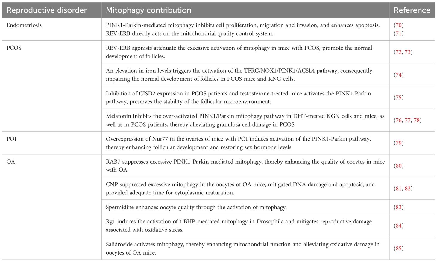 POI, characterized by the premature depletion of ovarian follicles before the age of 40, is a major contributor to female infertility (107). Mitophagy plays a critical role in maintaining ovarian function by mitigating excessive ROS accumulation and preventing mtDNA damage. However, excessive activation of mitophagy may contribute to the development of POI. Miao et al. demonstrated that in POI mice, the expression levels of PINK1 and Parkin were elevated in the ovaries, accompanied by an increased number of autophagosomes and autolysosomes in GCs, suggesting that excessive mitophagy is involved in the pathogenesis of POI (108). A cohort study involving 375 patients identified mitophagy as a potential therapeutic target for POI (109). Sequencing analysis revealed a homozygous single-nucleotide insertion in exon 1 of the SPATA33 gene (NM_153025.2: c.34dup; p.Cys12LeufsTer2). SPATA33, a protein exclusively expressed in mitochondrial germ cells, has been recognized as a novel mediator of mitophagy (110), providing genetic evidence linking POI with mitophagy. There are varying perspectives on the precise relationship between mitophagy and the pathogenesis of POI. Some studies have indicated that the pathological process of POI is closely associated with the suppression of the PINK1-Parkin pathway (111, 112). Yao et al. overexpressed neurotrophin-induced gene B (Nur77) in the ovaries of POI mice. Nur77, a member of the nuclear hormone receptor NR4A family, regulates pathological processes such as metabolic abnormalities, hypoxia stress, and inflammation. Activation of Nur77 can induce PINK1-Parkin pathway-mediated mitophagy, thereby improving follicular development and sex hormone levels in POI mice and enhancing ovarian function. However, this study lacked a control group with inhibited mitophagy and did not include recovery experiments following Nur77 overexpression (79). Compared to other reproductive disorders, research on POI is extensive and diverse, offering multiple perspectives for future investigations and aiding in the elucidation of the precise mechanisms of mitophagy’s involvement.