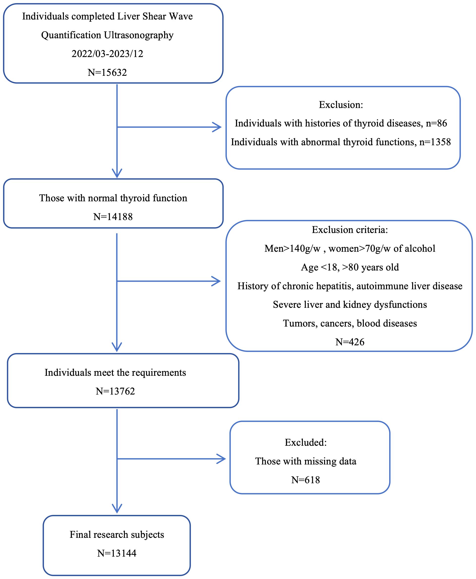 We selected 15,632 individuals who underwent liver shear wave quantification ultrasonography (Mindray, Shenzhen, China) at the Physical Examination Center of the First Affiliated Hospital of the University of Science and Technology of China from March 2022 to December 2023. The study population was drawn from the same city and consisted mainly consisting of individuals engaged in light physical labor, along with some freelancers. We employed the complete case analysis method. For individuals with missing data, the information was excluded. Based on the exclusion and inclusion and exclusion criteria as the evaluation conditions, 13,144 individuals were finally selected as the study subjects (Figure 1).