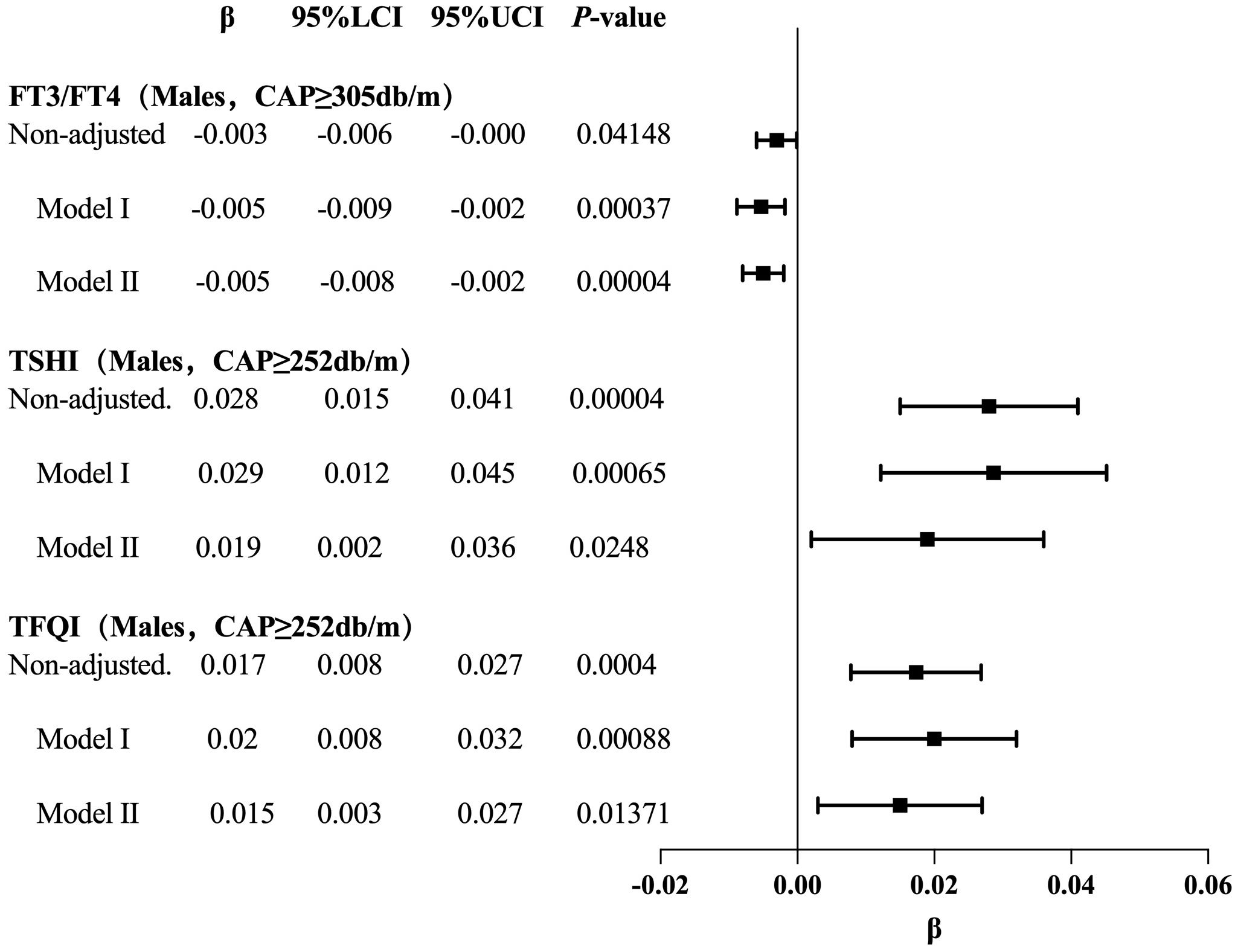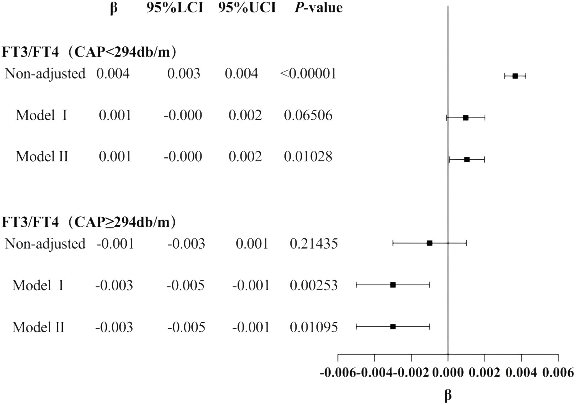 The results for the male group with CAP ≥305 dB/m (N = 687) of trend tests of multiple regression equations between CAP and FT3/FT4 showed that as the CAP quartiles increased, FT3/FT4 decreased significantly; for each increased quartile in CAP, FT3/FT4 decreased by 0.005 (β = −0.005, p = 0.0004).