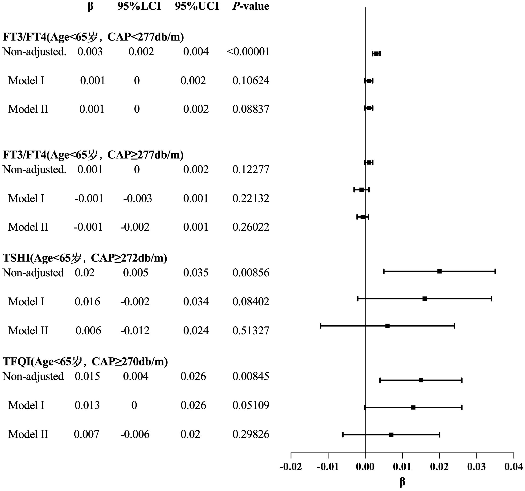 For the age <65 years group with CAP <277 dB/m (N = 9,193), trend analysis of multiple regression equations between CAP and FT3/FT4 showed that as the CAP quartiles increased, the trend of gradually increasing FT3/FT4 was not statistically significant. For the age <65 years group with CAP ≥277 dB/m (N = 3,121), trend analysis of multiple regression equations between CAP and FT3/FT4 showed that as the CAP quartiles increased, the trend of gradually decreasing FT3/FT4 was not statistically significant.