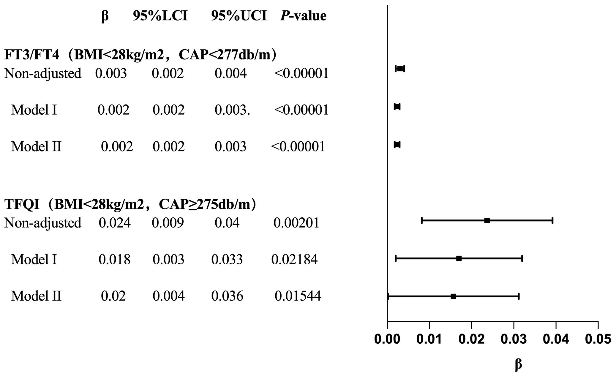 The results for BMI <28 kg/m² with CAP <277 dB/m (N = 9,312) of trend analysis of multiple regression equations between CAP and FT3/FT4 showed that as the CAP quartiles increased, the trend of gradually increased FT3/FT4 reached statistical significance; for each increased quartile in CAP, FT3/FT4 increased by 0.002 (β = 0.002, p < 0.00001).