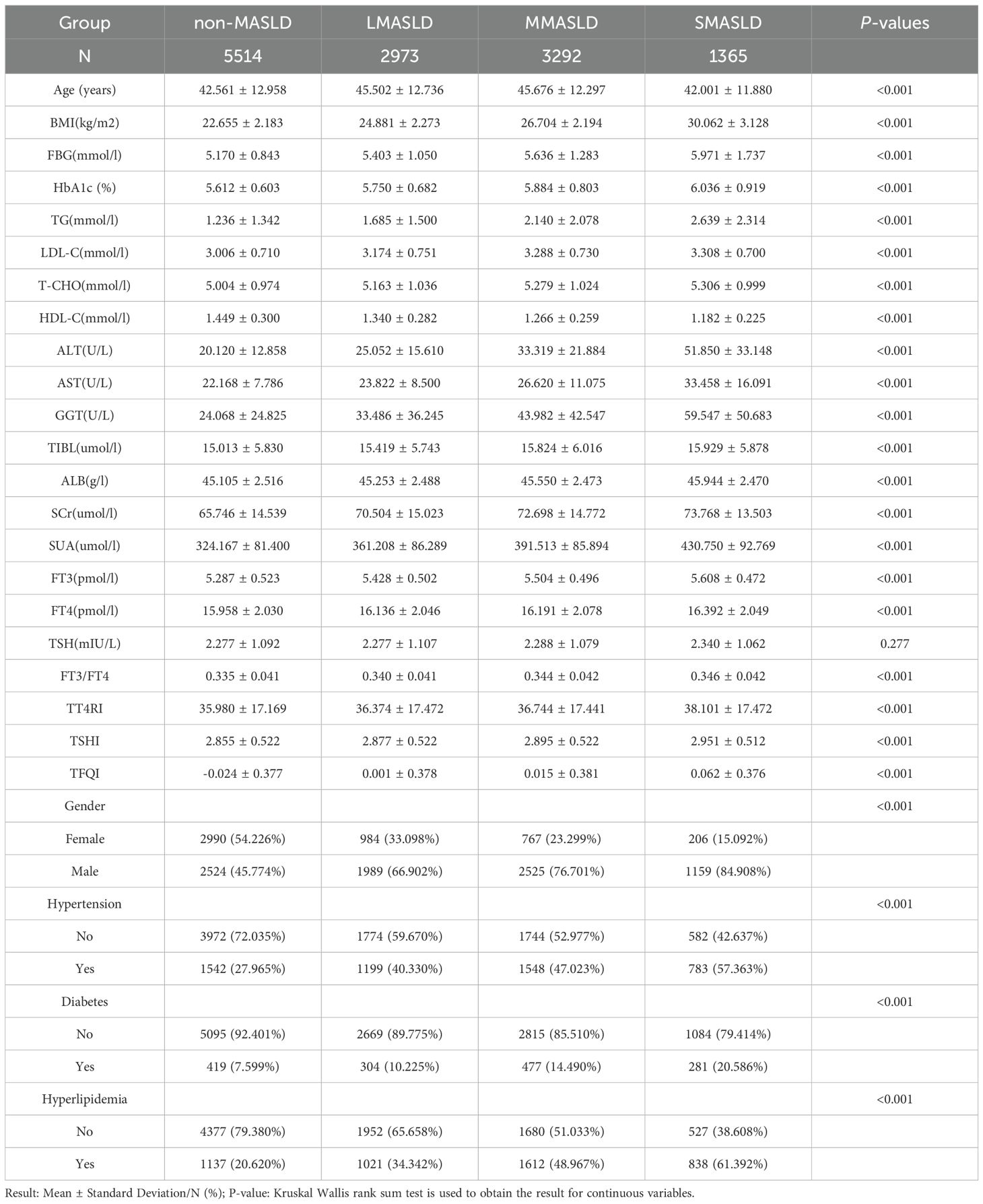 Grading of liver fatty infiltration: mild MASLD: 240db/m ≤ CAP < 265db/m; moderate MASLD: 265db/m ≤ CAP < 295db/m; severe MASLD: CAP ≥ 295db/m. Body mass index (BMI) = weight (kg)/height2 (m2); FT3/FT4 = FT3 (pmol/L)/FT4 (pmol/L); TFQI= (cdf) FT4–(1–(cdf) TSH); TT4RI = FT4 (pmol/L) × TSH (mIU/L); TSHI=LnTSH (mIU/L) + 0.1345 × FT4 (pmol/L).