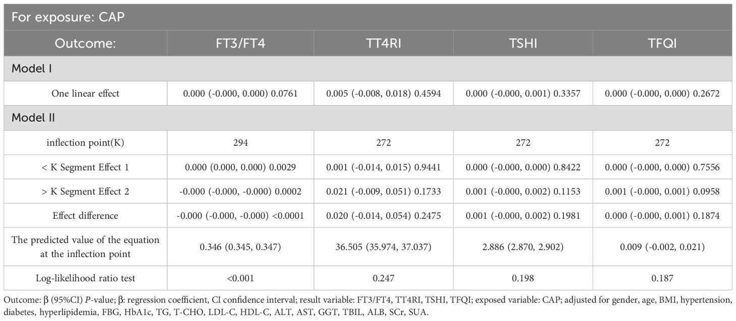 Table 8. Threshold effect analysis of BMI subgroup analysis of the relationship between CAP and thyroid hormone sensitivity indicators.