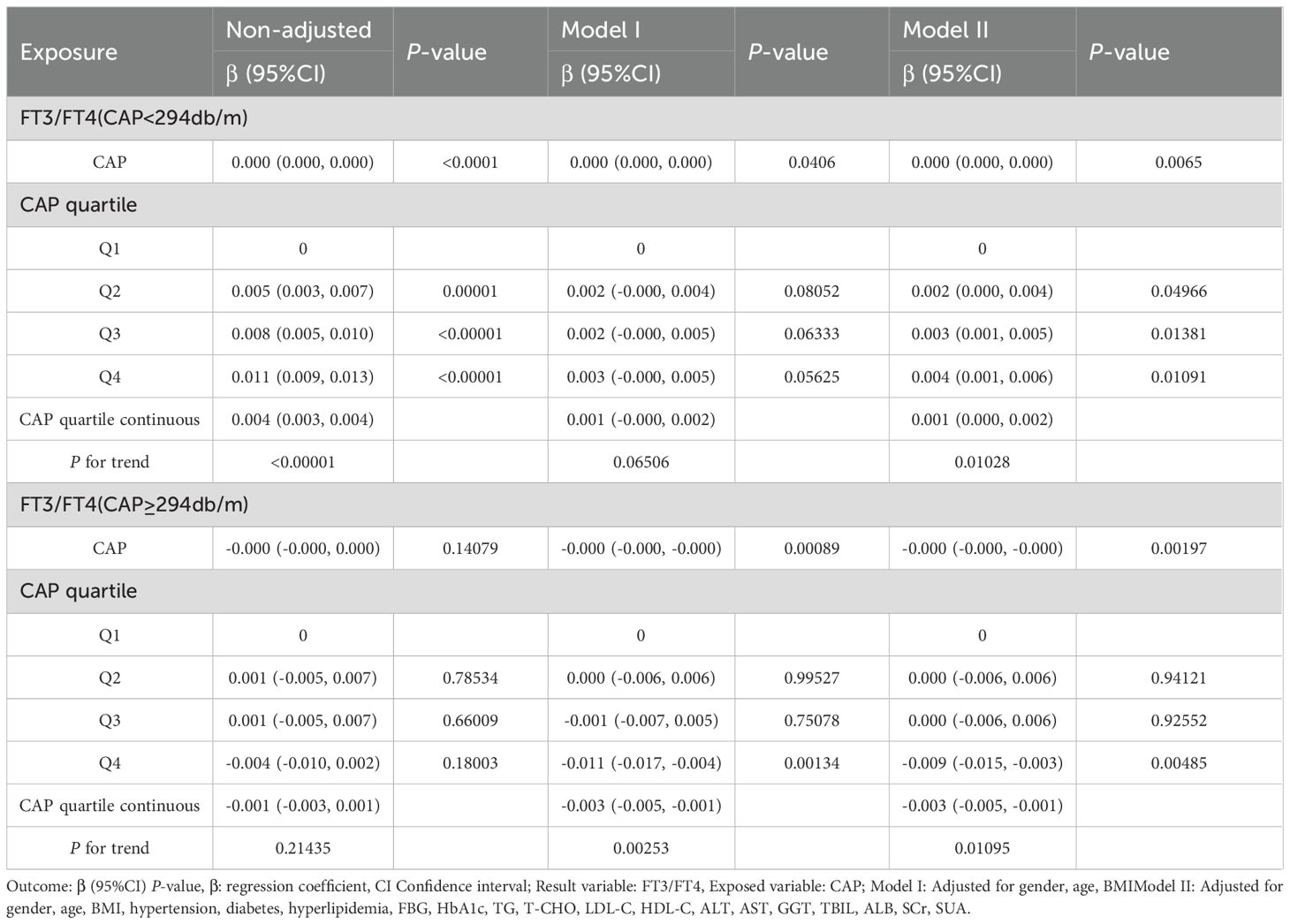 The smooth fitting curve and threshold saturation analysis revealed that CAP was positively correlated with FT3/FT4 before the inflection point (CAP = 294 dB/m) but negatively correlated after the inflection point. To verify whether these correlation trends had statistical significance, trend tests of multiple regression equations were performed. Trend p values were statistically analyzed using CAP quartiles as continuous variables. Model I adjusted for gender, age, and BMI. Model II adjusted for gender, age, BMI, hypertension, diabetes, hyperlipidemia, FBG, HbA1c, TG, T-CHO, LDL-C, HDL-C, ALT, AST, GGT, TBIL, ALB, SCr, and SUA.