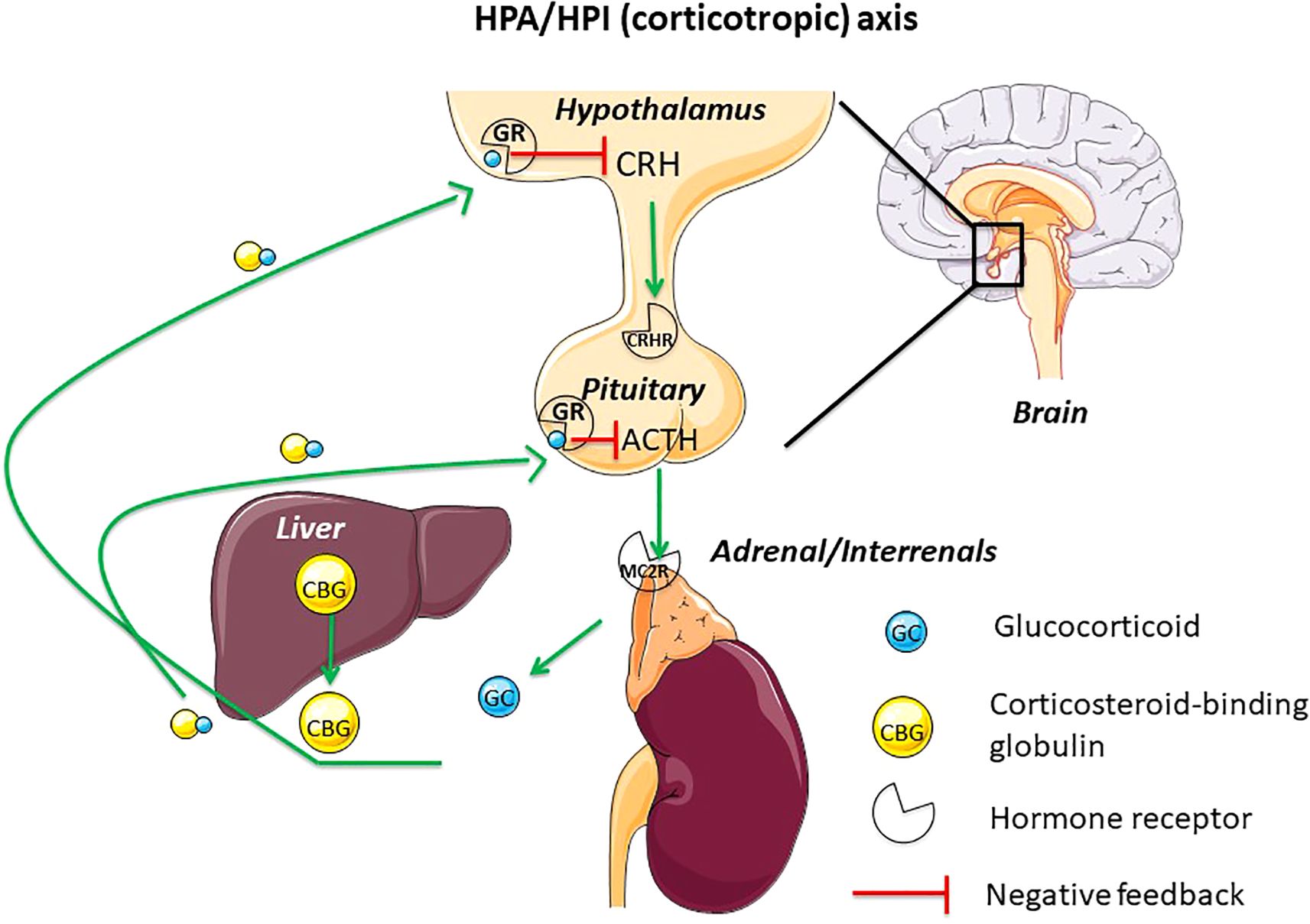 Figure 1. This figure displays the main actors of the hypothalamus-pituitary-adrenal/interrenal axis (HPA/HPI) (corticotropic or stress axis) in vertebrates. CBG, mainly synthetized by the liver, is released in the blood where it binds GC. GC will operate subsequently a negative feedback on hypothalamus and pituitary. ACTH, adrenocorticotropic hormone; CBG, corticosteroid-binding globulin; CRH, corticotropin-releasing hormone; CRH-R, corticotropin-releasing hormone receptor; GC, glucocorticoid; GR, glucocorticoid receptor; HPA, hypothalamus-pituitary-adrenal axis; HPI, hypothalamus-pituitary-interrenal axis; MC2R, melanocortin receptor 2.
